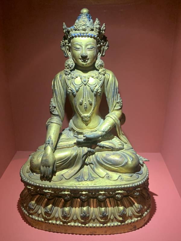 尺寸:高约25cm 年代:明代宣德 质地:铜鎏金 风格:宣德 明代宫廷 来源:中国国家博物馆 参阅:外部链接 鉴赏: 此尊造像着菩萨装,螺发戴冠,眉如初月,双目下视,神态庄重祥和。左手结禅定印,右手施触地印,结跏跌坐于莲座上。佛像身下的莲座铸造精细优美,莲瓣比永乐时期造像的莲瓣略宽,花瓣尖端饰卷云纹。莲座上刻“大明宣德年施”款。