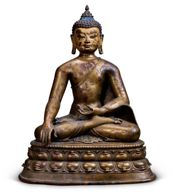 尺寸: 高约30.5cm 年代: 13世纪 质地: 合金铜 风格: 西藏 来源: 中国国家博物馆 参阅: 外部链接 鉴赏: 此像为螺发,面部泥金,身披袈裟。左手结禅定印,右手施触地印,结跏跌坐于莲座上。莲座的莲瓣大而圆润,具有明显的元代造像风格. 13至15世纪,西藏造像一扫以往的稚拙之风,身体比例称,身躯舒展,手脚极富写实性