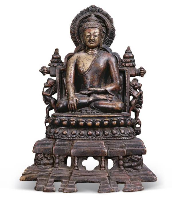 尺寸: 高约18cm 年代: 15世纪 质地: 合金铜 风格: 西藏 帕拉 来源: 中国国家博物馆 参阅: 外部链接 鉴赏: 此像样式古朴,制作精致。火焰形头光,简化的具光,高大的折角台座是帕拉风格特点,这是西藏地区造像工艺成熟以后模仿古印度风格的作品。