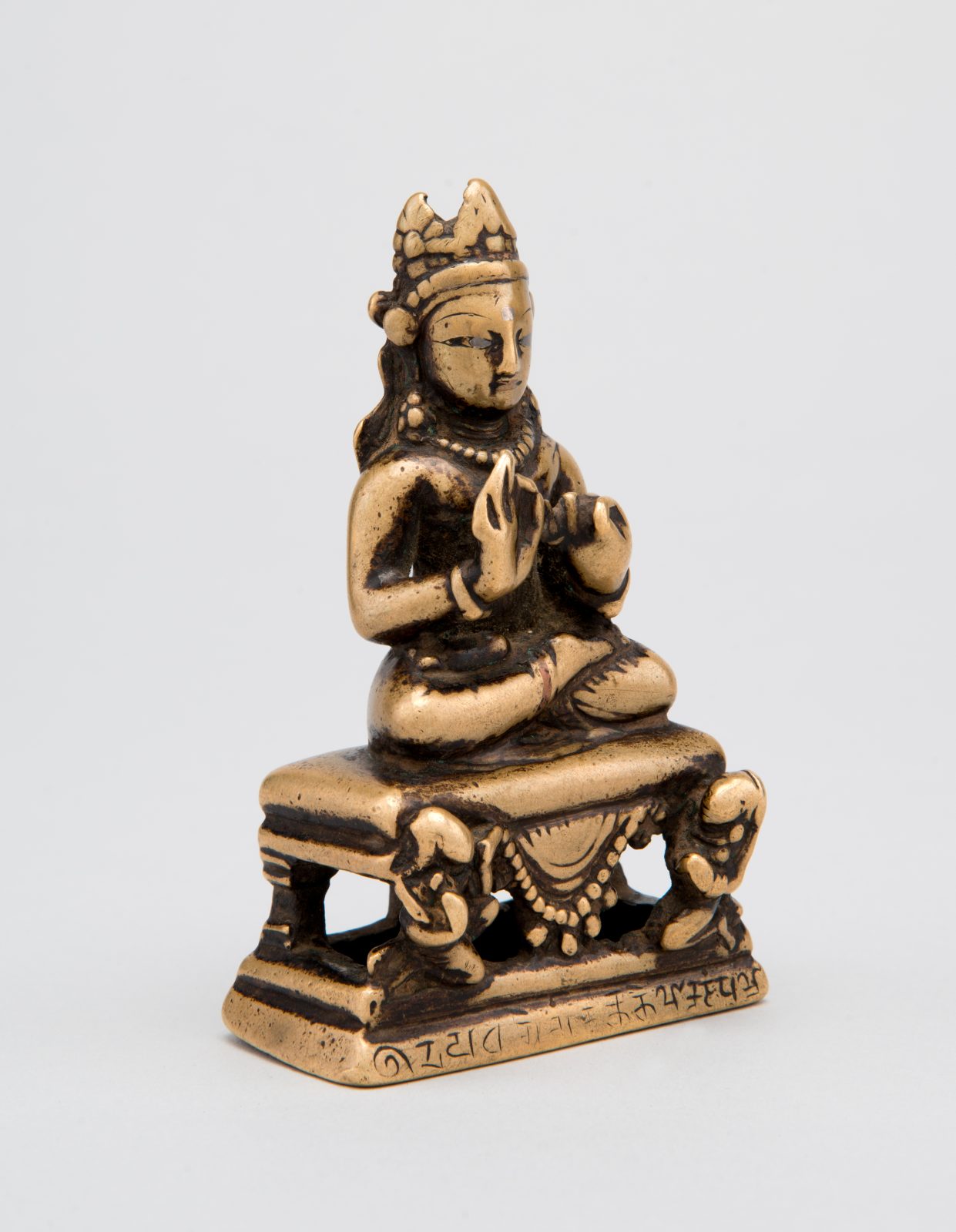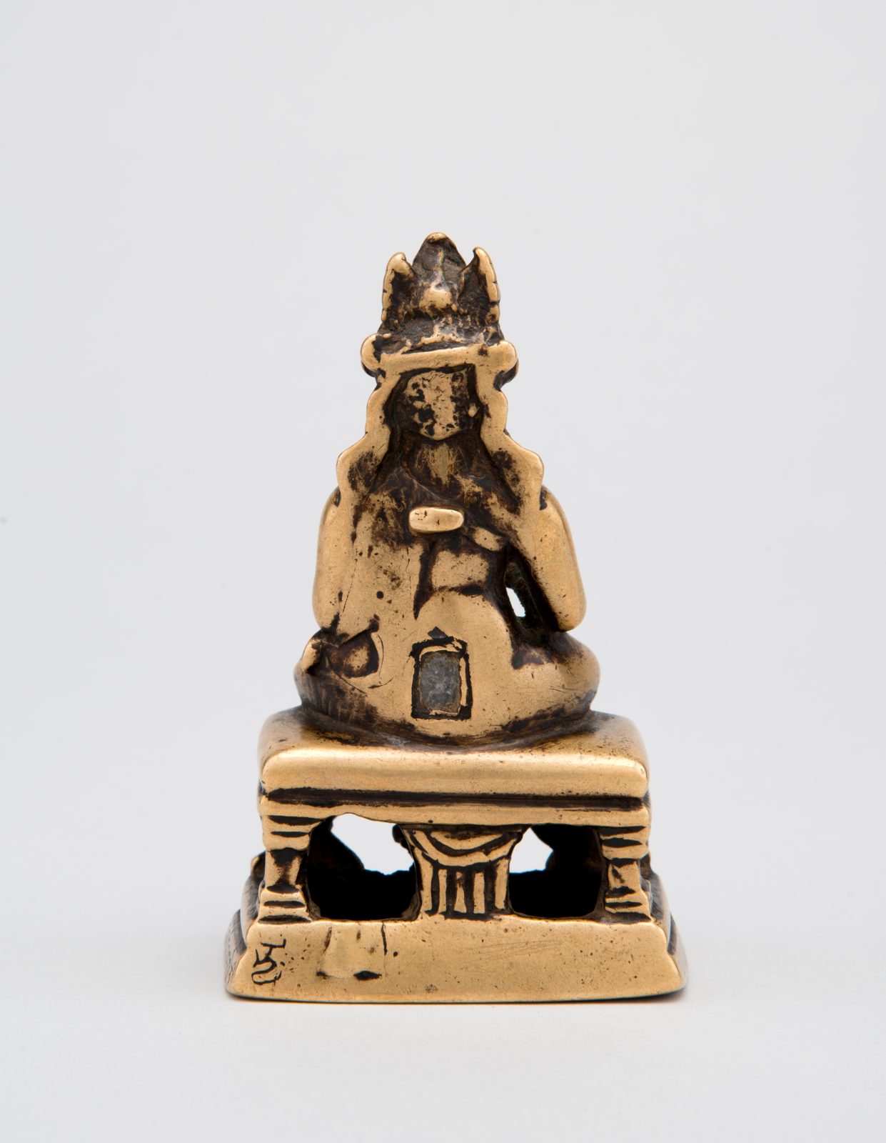 尺寸:4 3/8 × 2 3/4 × 1 3/4 in. 年代:8世纪 质地:黄铜 风格:克什米尔 来源:美国鲁宾艺术博物馆 参阅:外部链接 鉴赏: Crowned Teaching Buddha Gilgit or Kashmir 8th century