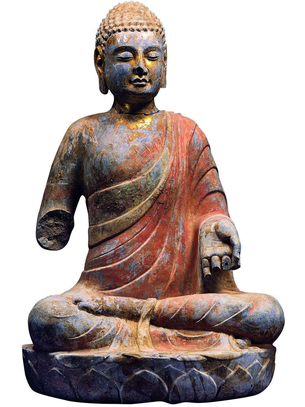 佛像头顶内罢低平,满头螺发,面相方园丰满,双目微闭,嘴角内陷,做含笑意,其面部及颈部都残存贴金痕迹,右管残断,左手手指虽残,但仍可看出其掌心向前施与愿印。宽肩挺胸,细腰收腹,体志雄健而有力度。身披右袈裟,薄厚适中,表面刻出阶梯式衣纹。袈裟大面积涂朱,色彩鲜艳,保存情况较好。主尊结跏趺坐于单层仰莲座上,基本造型与其他地区同一时期的造像较为接近。