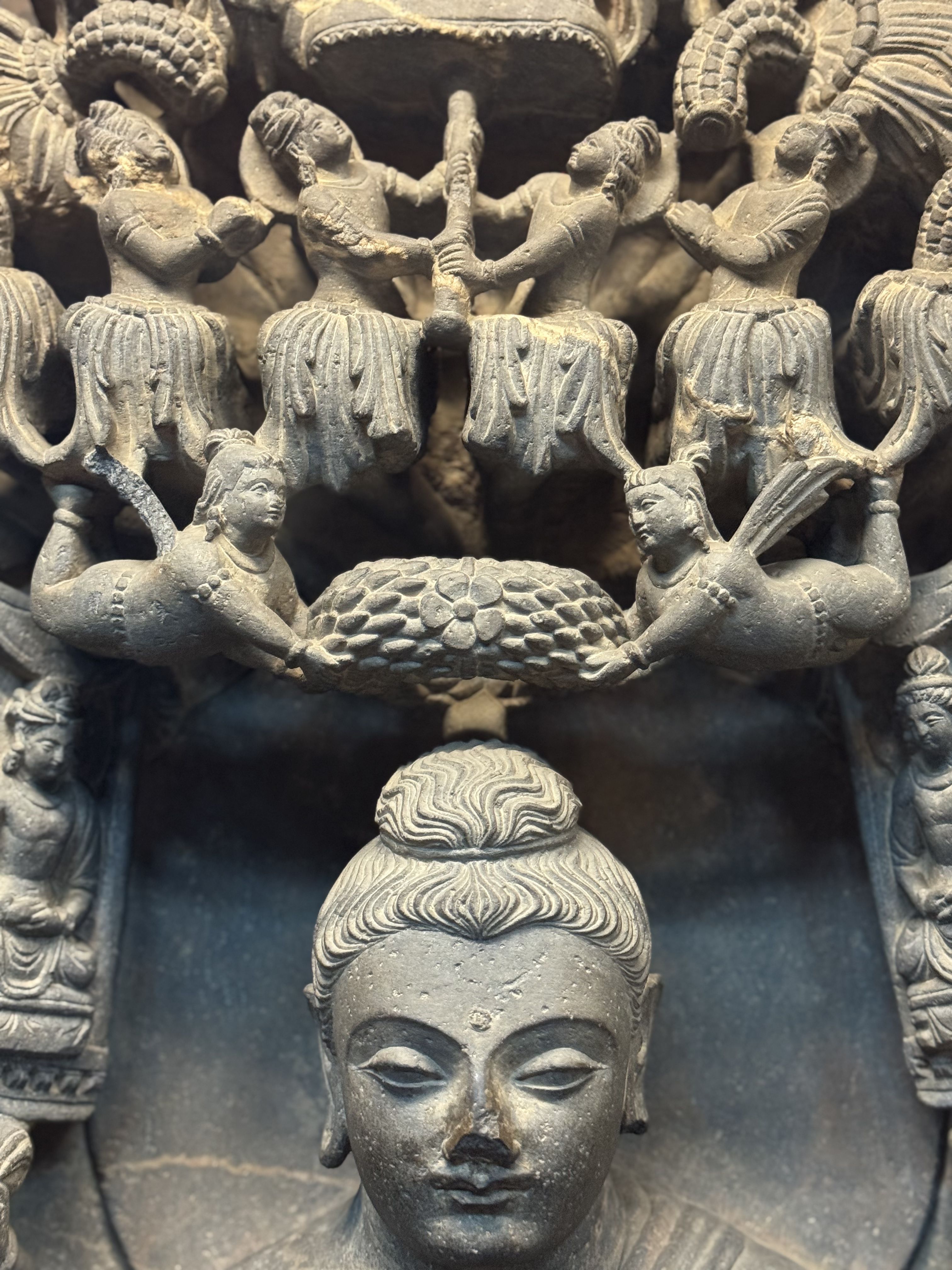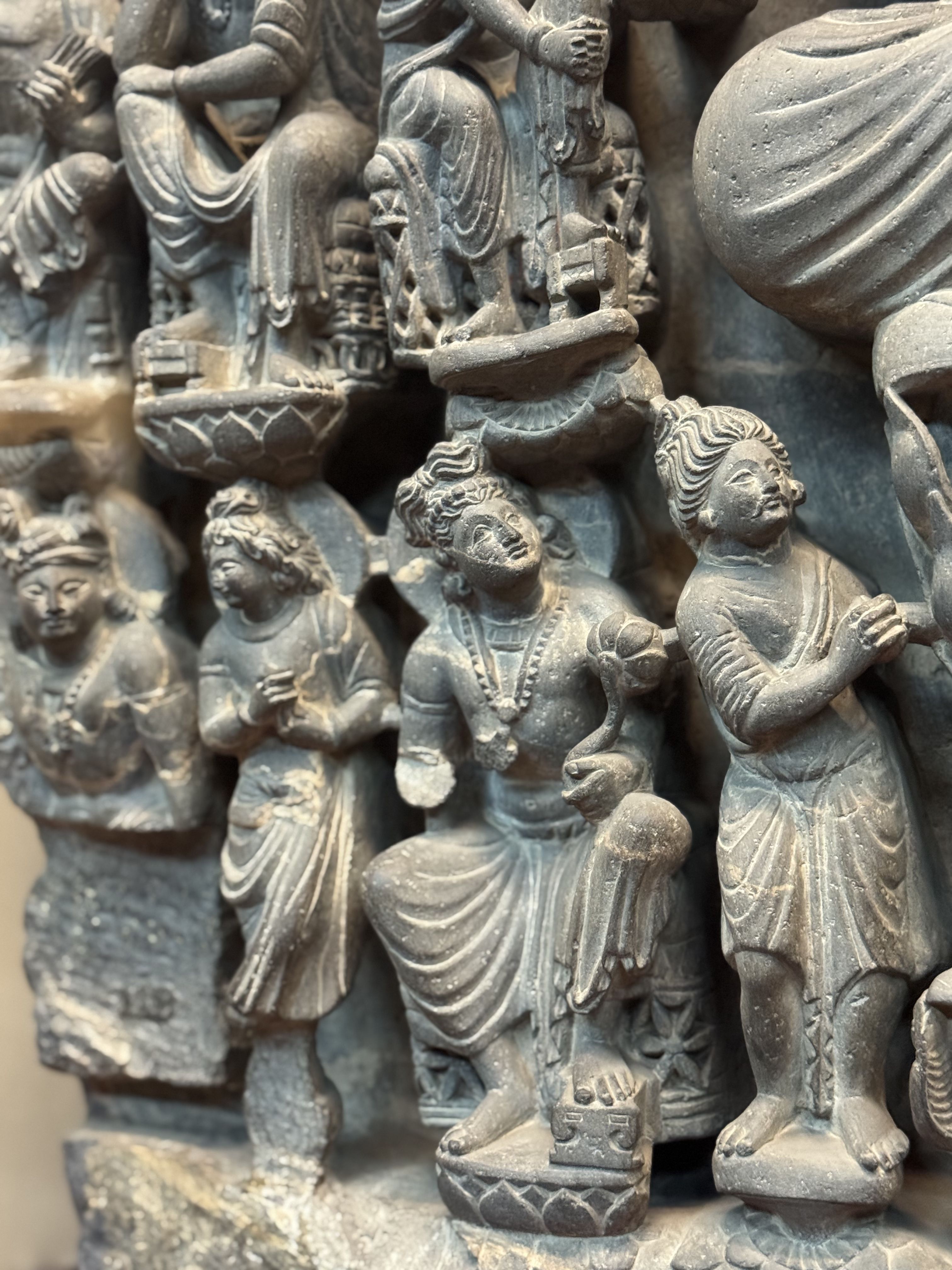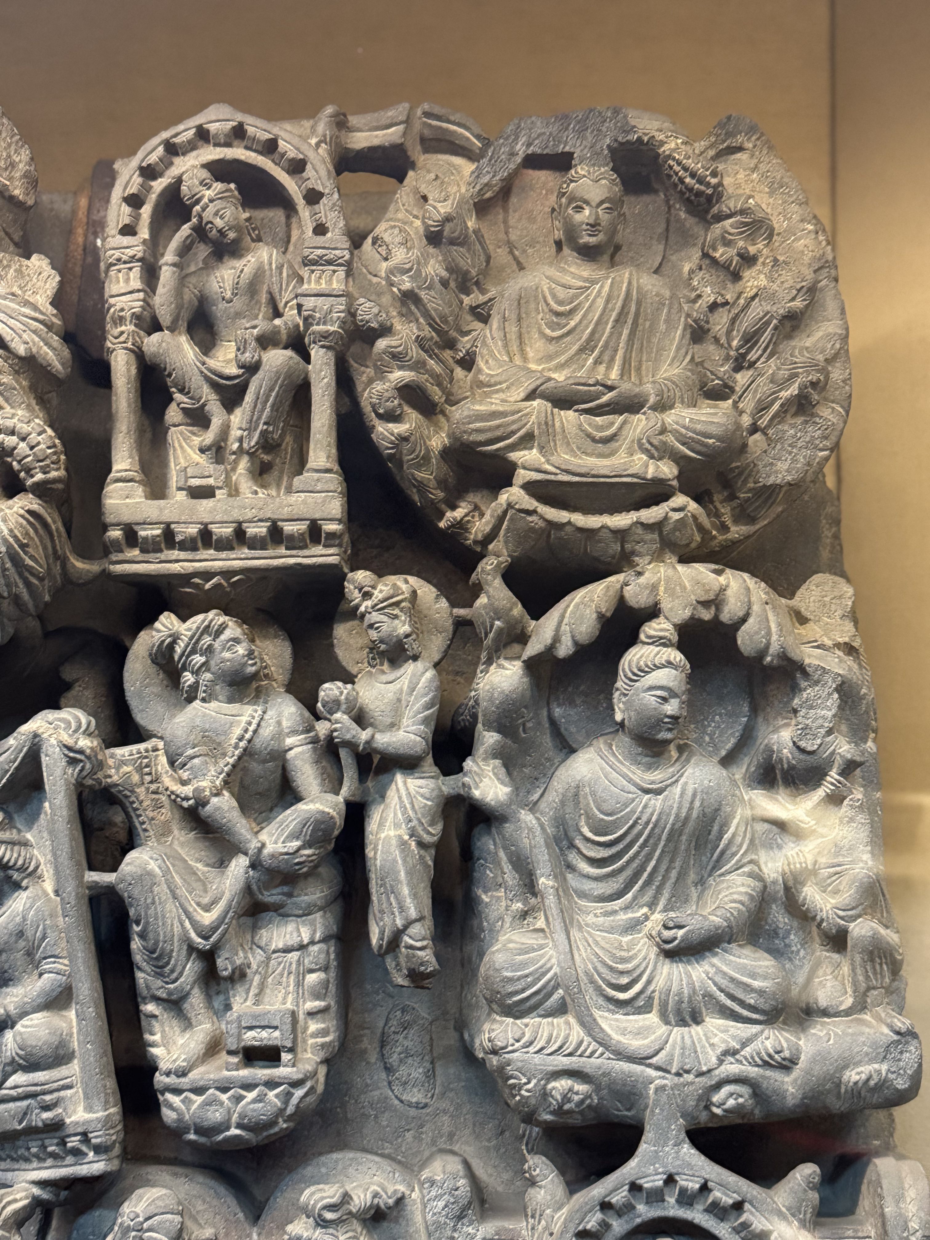 我翻译了下博物馆的注释(博物馆注释见最后一张图片): 舍卫城有质疑佛陀教义的人,为终结争论,舍卫城国王邀请佛陀赴会。当众人在大堂等候佛陀降临之际,浓云忽至,佛陀赫然显现于中央。佛陀以目光在天际铺就通道,凌空而起沿路徐行。继而令池中千瓣金莲绽放,自身化身跌坐莲台结说法印,众多佛与菩萨环绕周围。此番神迹令大批民众皈依佛门,这件犍陀罗雕塑正是上述故事末段的壮丽呈现。