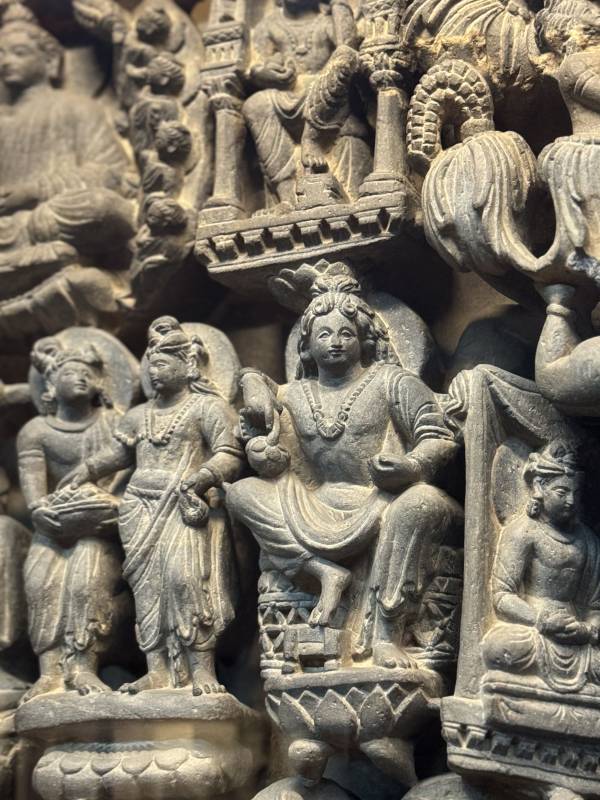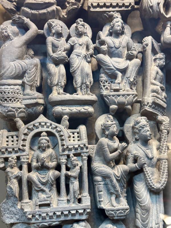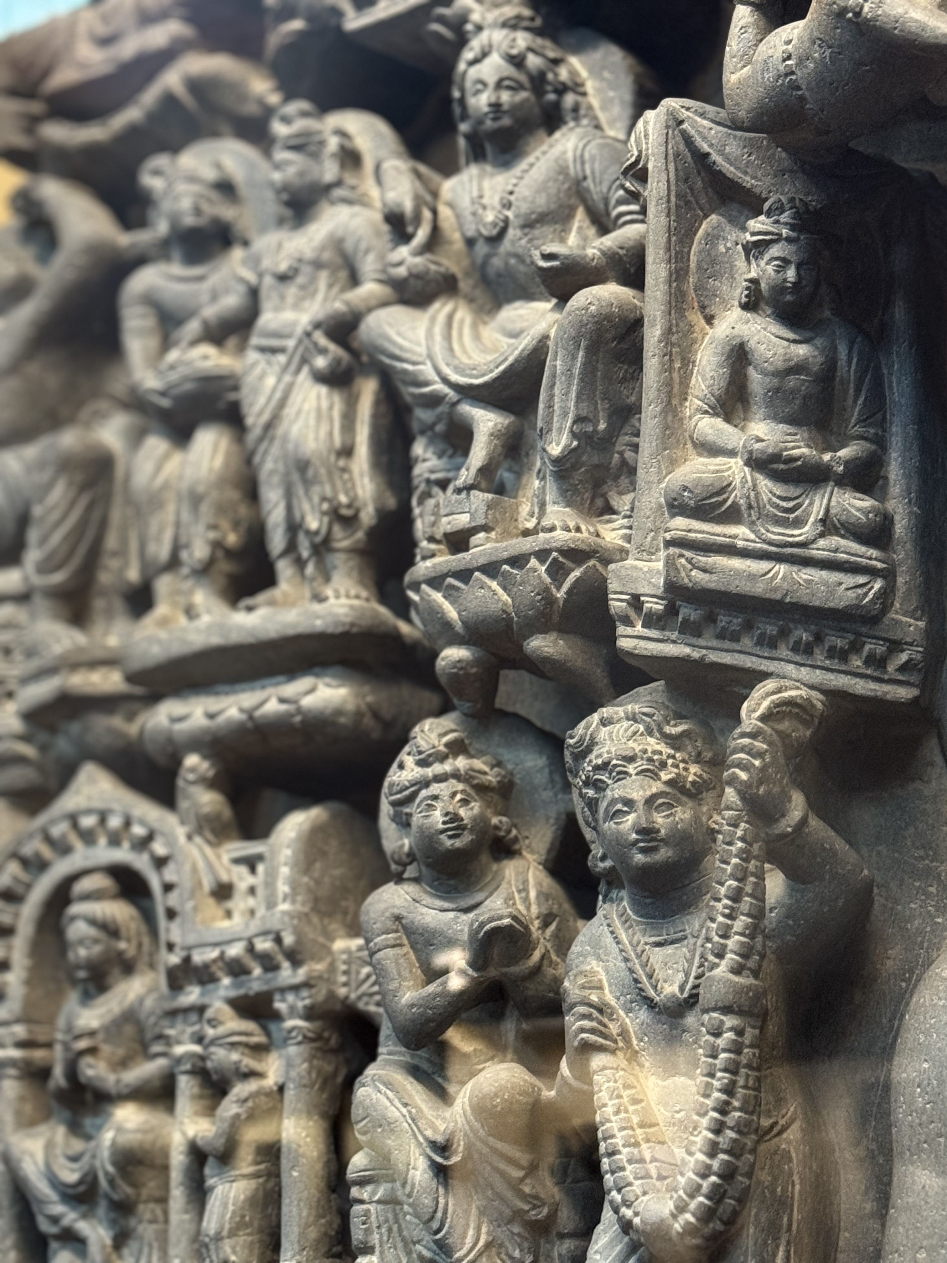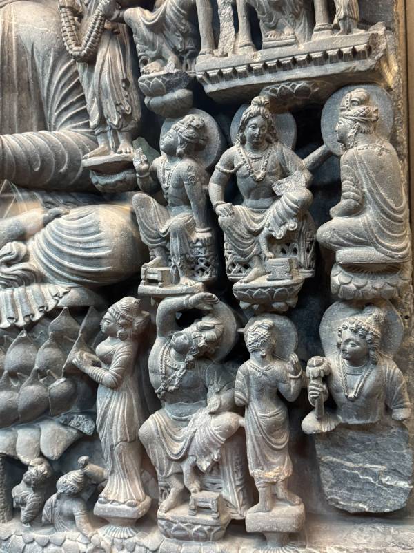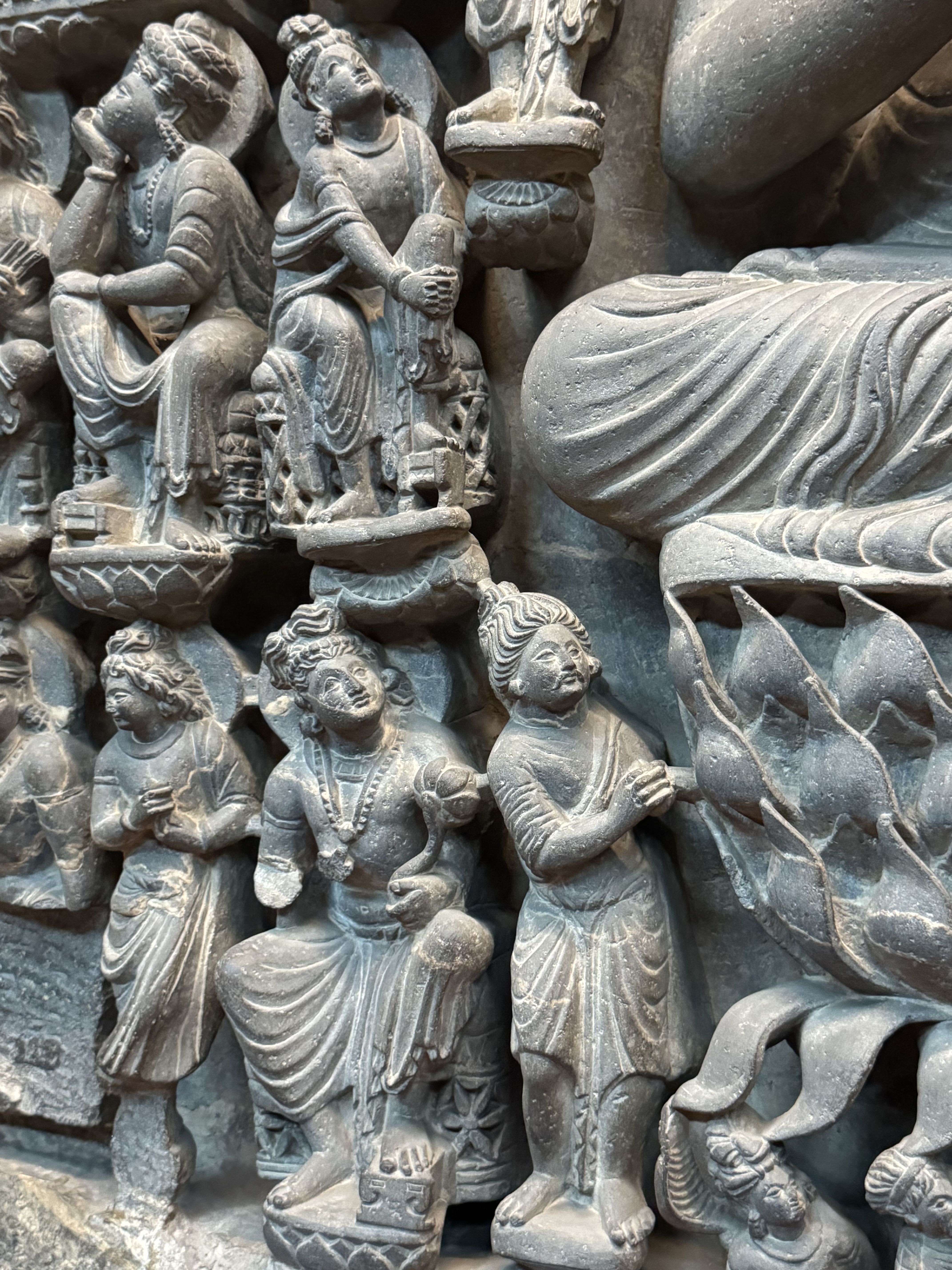 我翻译了下博物馆的注释(博物馆注释见最后一张图片): 舍卫城有质疑佛陀教义的人,为终结争论,舍卫城国王邀请佛陀赴会。当众人在大堂等候佛陀降临之际,浓云忽至,佛陀赫然显现于中央。佛陀以目光在天际铺就通道,凌空而起沿路徐行。继而令池中千瓣金莲绽放,自身化身跌坐莲台结说法印,众多佛与菩萨环绕周围。此番神迹令大批民众皈依佛门,这件犍陀罗雕塑正是上述故事末段的壮丽呈现。