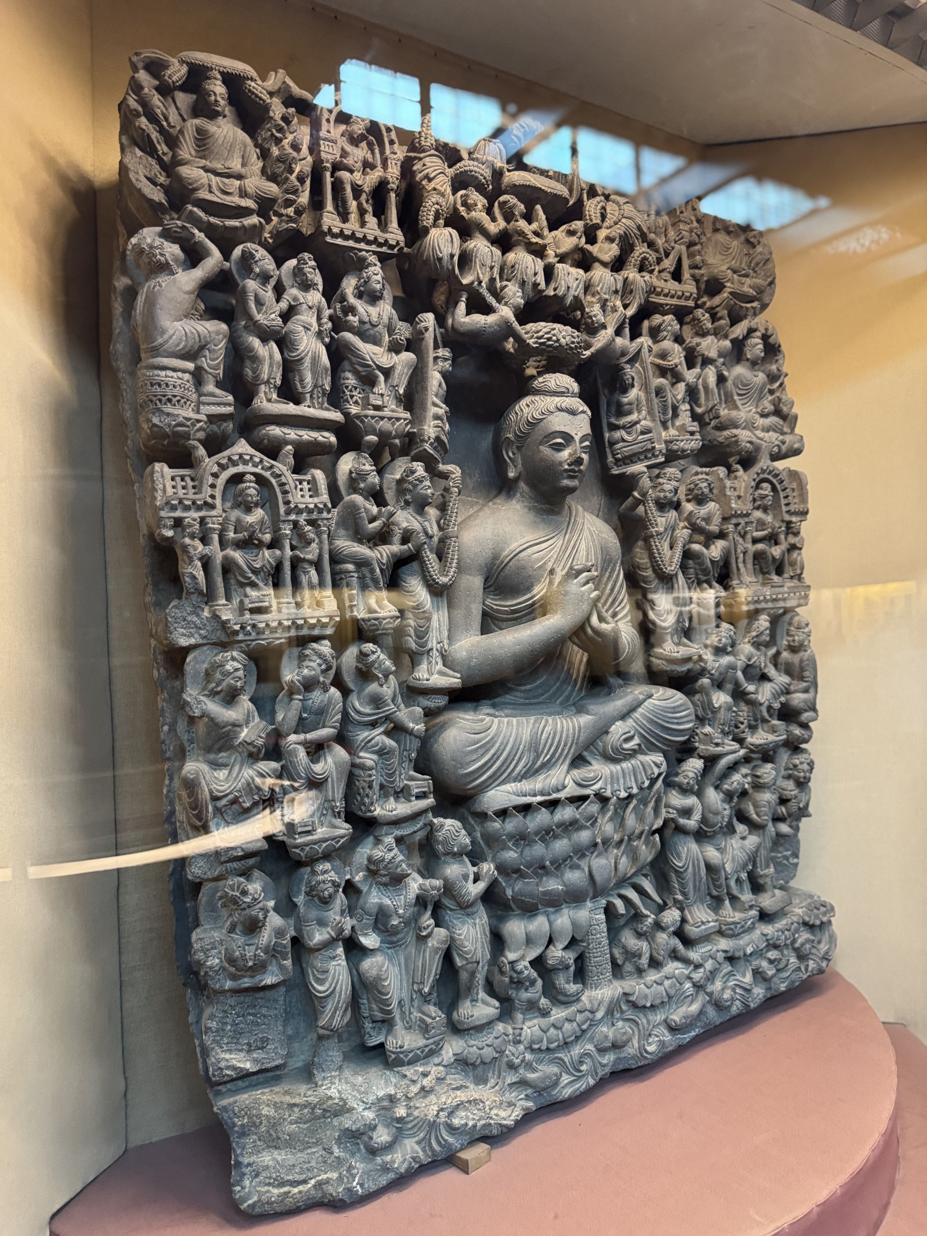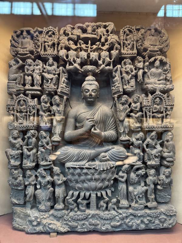 拉合尔博物馆犍陀罗展厅,右手边中间位置就是这尊镇馆之宝-舍卫城神变图(The Miracle of Sravasti,又称大光明神变图),制作于2世纪。