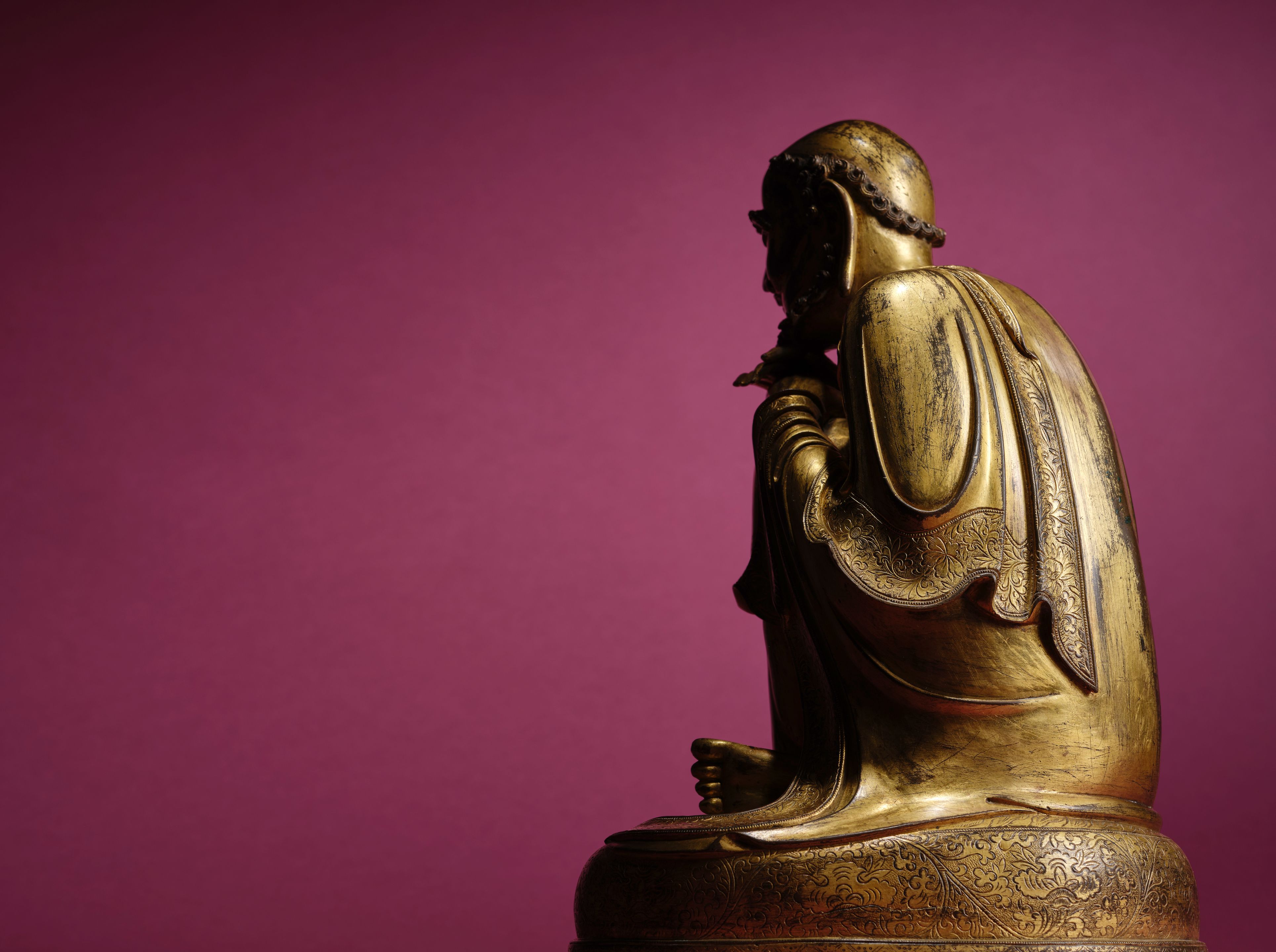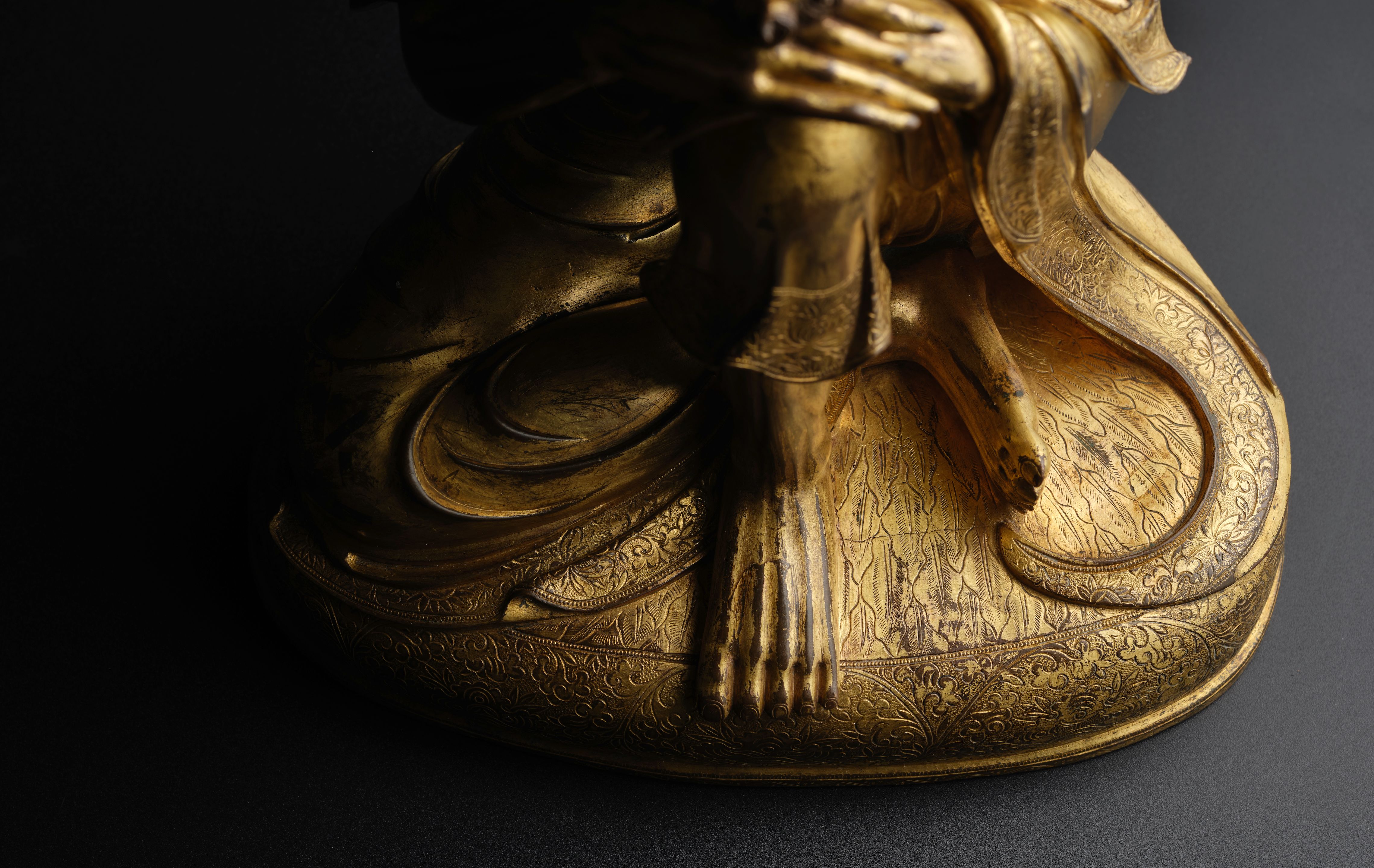 As noted by the Cleveland Museum, the exceptional fine workmanship of the Cleveland Museum Buddha Shakyamuni as an Ascetic strongly points to it having been made in the official workshops under imperial auspices. Close comparison between the Cleveland Museum and Speelman figures clearly demonstrates that both were almost certainly produced by the same workshop. This is evident in the similarities of the modelling and poise, the form of the stepped rounded stand on which the Buddha seats, the delicate and highly refined style of the decorative floral scrolls, the folds of the robe, and the treatment of the facial features – all of which are highly distinct.
