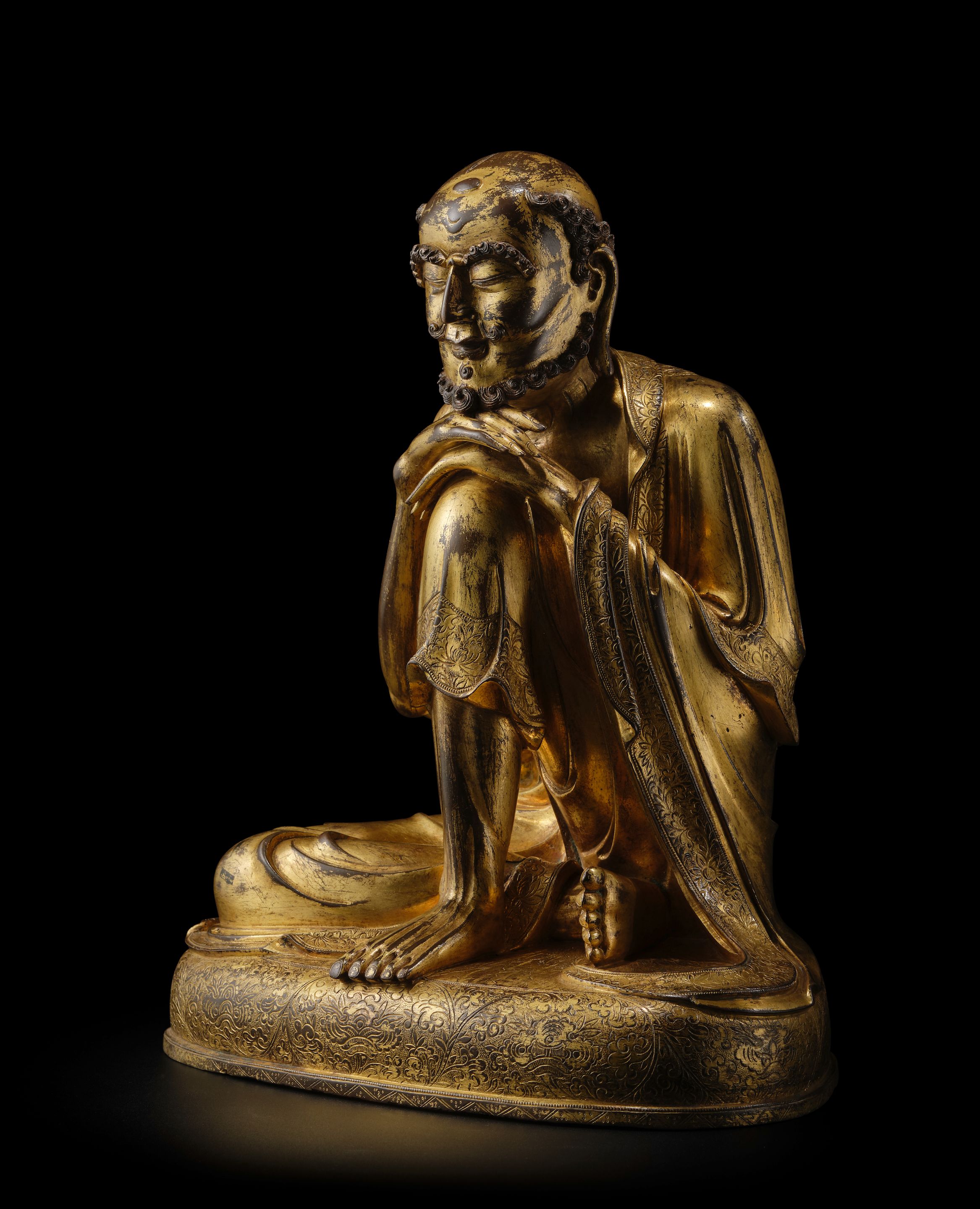 This figure is exceedingly rare, with the most similar comparable example is a gilt-bronze Ascetic Shakyamuni, Yuan dynasty, early 1300s, preserved in the Cleveland Museum of Art (fig. 1; 1966.116), illustrated in The Cleveland Museum of Art, Handbook of the Cleveland Museum of Art, 1966, p. 261; 1969, p. 261; 1978, p. 345; and exhibited in Cleveland Museum of Art, Chinese Art Under the Mongols: The Yuan Dynasty (1279-1368), 2 October – 24 November 1968; Asia House, New York, 16 January – 2 March 1969; as well as Cleveland Museum of Art, Asian Autumn: Masterpieces from the Collection. The Cleveland Museum of Art, Cleveland, Ohio, 17 September 1991 – 5 January 1992.