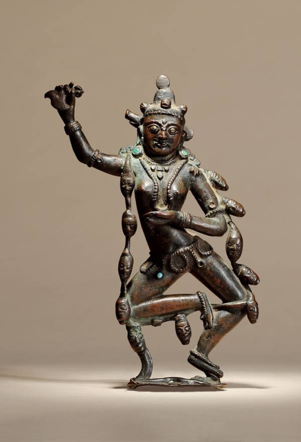 金刚亥母为无上瑜伽母续本尊之一,是上乐金刚的明妃。此尊头戴五骷髅冠,发髻高耸,五官刻画对称写实,面呈忿怒相,粗眉大眼,嘴长獠牙,头部右侧长出标志其身份的猪首。猪在佛教中是三毒(贪、嗔、痴)中痴毒的象征,金刚亥母是清除众生愚痴的斗士。此尊呈舞蹈站姿,肢体健美,左手于腹前持嘎巴拉碗,右手上举钺刀,脚踩人尸,身披鲜人首鬟,颈部、腰部、手臂、手腕及脚踝配饰以连珠纹的形式表现,嵌绿松石。此像为合金铜铸造,双眼、项链及手钏均嵌银,整体风格古朴厚重,为难得的藏西风格造像精品。