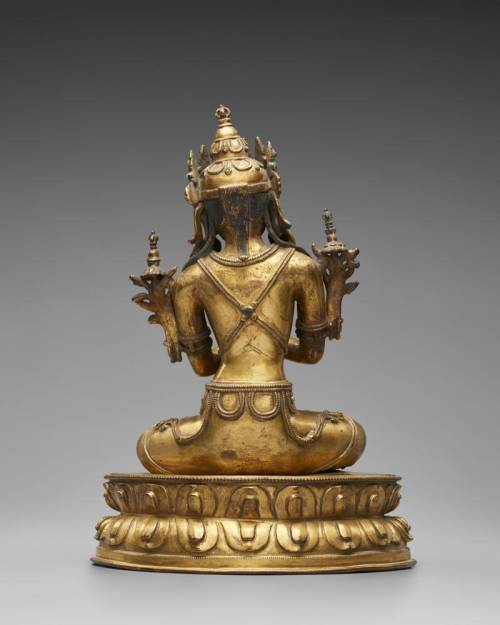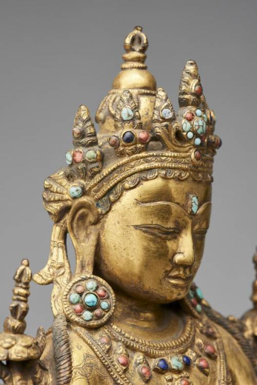 Tiny pieces of turquoise (from Afghanistan and China) and coral (from Italy), beloved by Tibetans for their brilliant colors, decorate this figure.