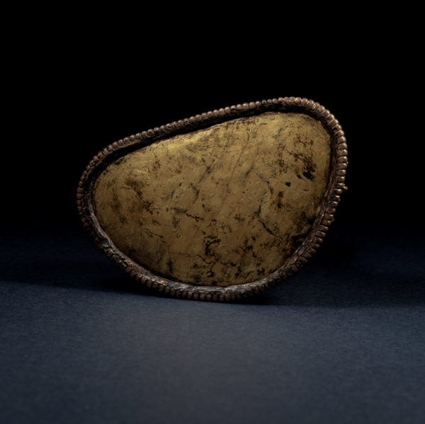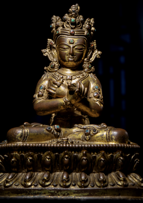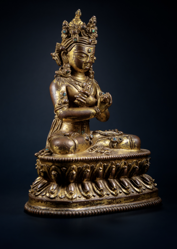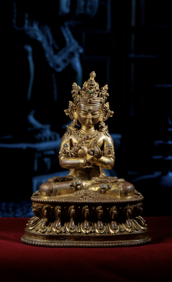 此尊金刚总持头戴尼泊尔造像上颇为流行的国王盔,前有高耸的花冠,耳际宝缯呈U字形向外翻卷,耳下垂花型耳环;额部高广,眉如弯月,双目低垂俯视,眉间饰白毫,面庞圆润,脸相祥和,高鼻细嘴,呈十六岁质朴童子相,妙相庄严、法喜充盈。双手置胸前交叉,结金刚吽迦罗印,左右手分别持金刚铃和金刚杵,铃杵组合象征慈悲与智能的合一,代表密教修行的最高修行成就和境界。莲座宽大,造型大方,下边缘各饰一周连珠纹。莲瓣饱满有力,大气舒展,各由花瓣形莲叶托起,形制美观大方;它们上下对称分布,周砸环绕一圈,封底完整。全像躯体壮硕,肌肉劲健,体态优美舒展,造型大气完美,多处镶嵌各类宝石充分表现了金刚持在藏传佛教中的至尊地位和悲智双圆的宗教特质.