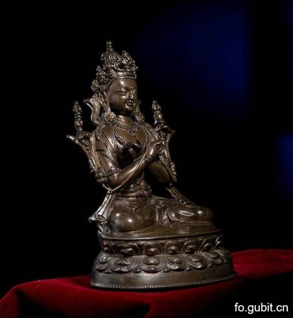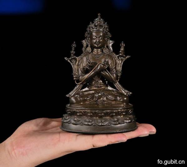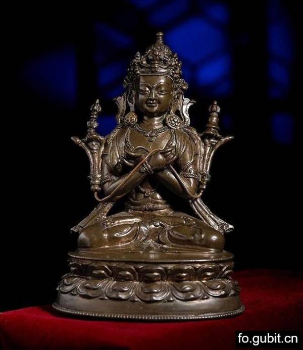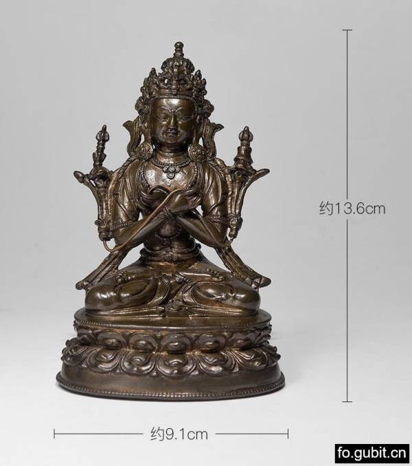 此尊金刚总持造像通体无镶嵌和鎏金,但其衣身上錾刻精细的纹理,以及对其发丝的刻画,都展现出此造像的不凡气质. 金刚总持头戴五叶花冠,头顶束高发髻,耳际宝缯呈U字形向外翻卷,耳下垂大圆耳环;额部高广,眉如弯月,双目俯视,眉间饰白毫,面相端庄,神态宁静。身后帔帛的尾端自然垂于体侧,下身着贴体薄裙,以双道联珠纹表现裙纹,裙纹纹式与披肩纹饰相互映衬。少见的是其双手并未持金刚铃杵,而是手心牵引莲茎,两朵莲花并肩绽放,其上分别托着金刚铃杵,手艺人对金刚铃杵的刻画更是极具心思,线条圆润的金刚铃端立于金刚的左肩,而棱角分明的金刚杵站立于金刚的右肩,其立体的姿态,就像是一枚真正的金刚杵,让人忍不住想要将其置于手中把玩。金刚总持全跏趺坐于双层仰覆莲座之上,莲瓣宽广秀长,高高突起,立体感极强。这尊佛像的一大亮点就是,其身上的錾刻的纹理精细无比,同时它背部、腰部、臀部关系的处理,扭动的曲线也让人百看不厌,自然灵巧,生动写实,可谓神来之笔。