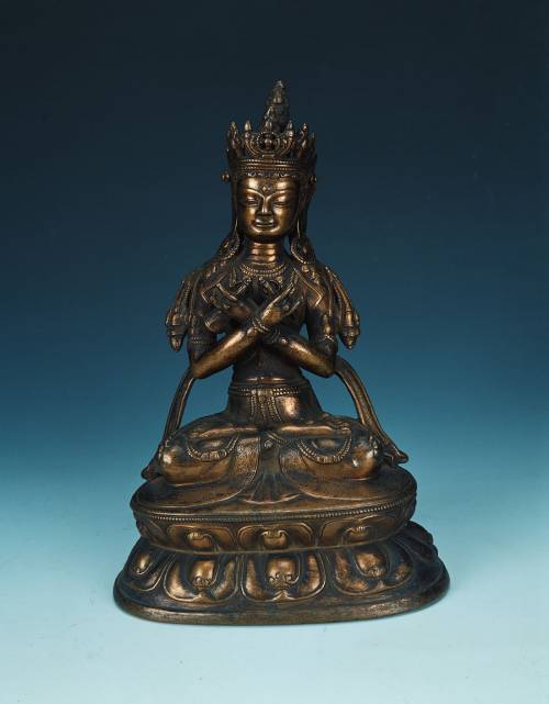 尺寸:高24.3cm 年代:14世纪 质地:合金铜 风格:西藏 来源:辽宁省博物馆 参阅:外部链接 鉴赏: 持金剛,也稱“金剛大持”、“秘密主”。在藏密中,金剛持被認爲是釋迦牟尼講說密法時所呈現的形象,是釋尊的秘密化身,故又稱秘密主。其形象爲甯靜的菩薩相,結跏趺坐,左手拿金剛鈴,右手拿金剛杵,兩手相交置于胸前。另一種形象是雙身像,擁抱明妃孫那利菩薩。鈴杵表示金剛部的菩薩摧毀魔敵時的智慧和法力。
