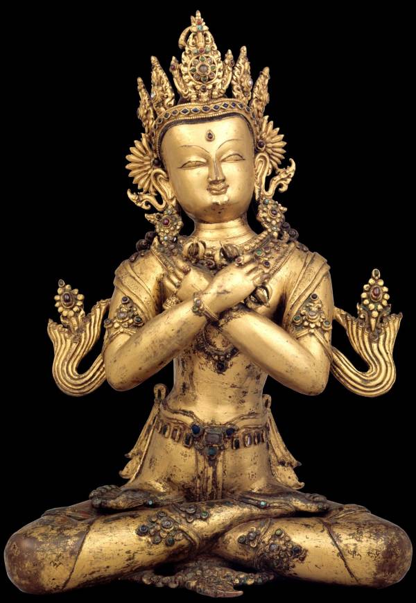 Vajradhara is the Primordial Buddha of Tantric Buddhism. His tranquil expression and seated posture are typical of peaceful depictions in Buddhist imagery, although his lavish adornments clearly identify him as a symbolic Buddha in a bodhisattva appearance. With his upward-gazing eyes, sharp nose, and gentle smile, Vajradhara has a playful and serene presence. On his head is an ornate vajra crown inlaid with precious stones and jewels. The flowing scarves and sway of the hips create a sense of movement and dance. The surface of his elegantly modeled body is richly adorned with armbands, necklaces, and belts, all inlaid with jewels.