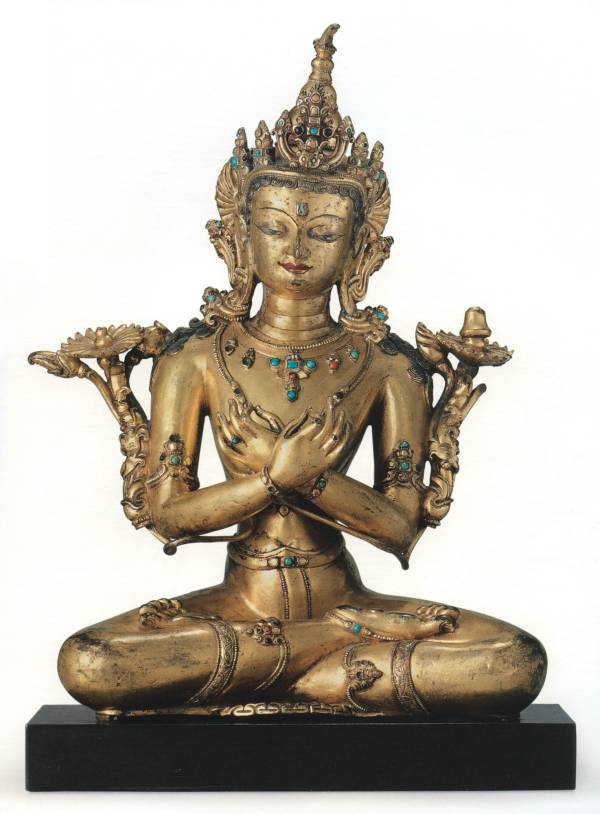 金刚持也称“金刚大持”、“秘密主”,在藏密中,被认为是释迦牟尼讲说密法时所呈现的形象,是释尊的秘密化身,故又称秘密主。一般而言,其形象大都为宁静的菩萨相,结跏趺坐,左手拿金刚铃,右手拿代表金刚部菩萨摧毁魔敌时的智慧和法力的金刚杵,两手相交置于胸前。也有另一种拥抱明妃孙那利菩萨的双身像。此尊佛像头戴花冠,头顶束高发髻,耳际宝缯呈U字形向外翻卷,耳下垂大圆环。额部高广,双目俯视,眉间饰白毫,高鼻小嘴,妙相庄严,佛身结跏跌端坐,双手置胸前交叉结期克印,各执一莲茎饰于肩侧,胸胸前饰项圈璎珞,帔帛搭于双肩自然垂于身体两侧,手足饰钏镯,装饰造型美观,立体感强,并于多处嵌有绿松石装饰,呈现浓郁的地域特色,应属十四世纪西藏夏鲁寺受到尼泊尔风格所影响而制造的器物。此类夏鲁寺风格造像以造型标准、做工精细着称于世,多呈和悦之相,额部较宽,下颌较窄。肩胸宽厚,四肢粗壮,颈短,腰细。头戴高耸的花冠,佩戴珠宝璎珞及钏镯等饰物。