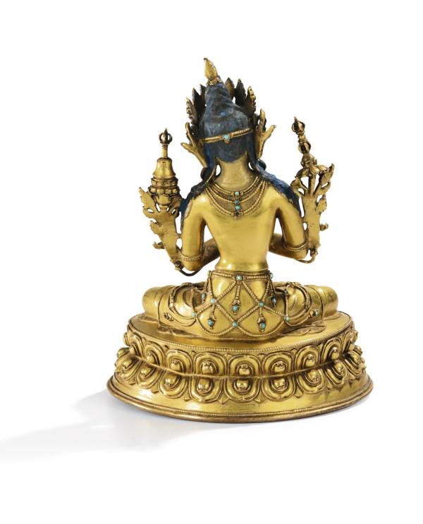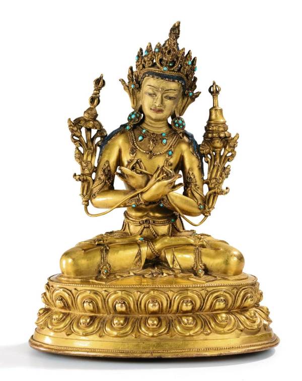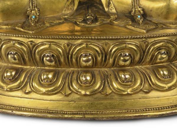 The figure is in overall good condition. It is heavily cast and richly gilt. The base is sealed and the plaque slightly domed. There is light wear to the gilding, especially to the knees and face. Some turquoise inlays are missing and other may be been replaced.The right flower stem is loose.