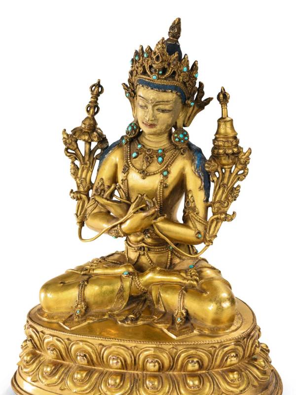 assis en vajrasana sur une double socle lotiforme, les mains croisées devant la poitrine tenant chacune délicatement une longue tige de lotus dont les fleurs s'épanouissent près des épaules et soutenant d'un côté un vajra et de l'autre une cloche ghanta, richement paré de bijoux incrustés de turquoises, le visage à l'expression sereine orné de l'urna, surmonté d'une couronne ouvragée, scellée