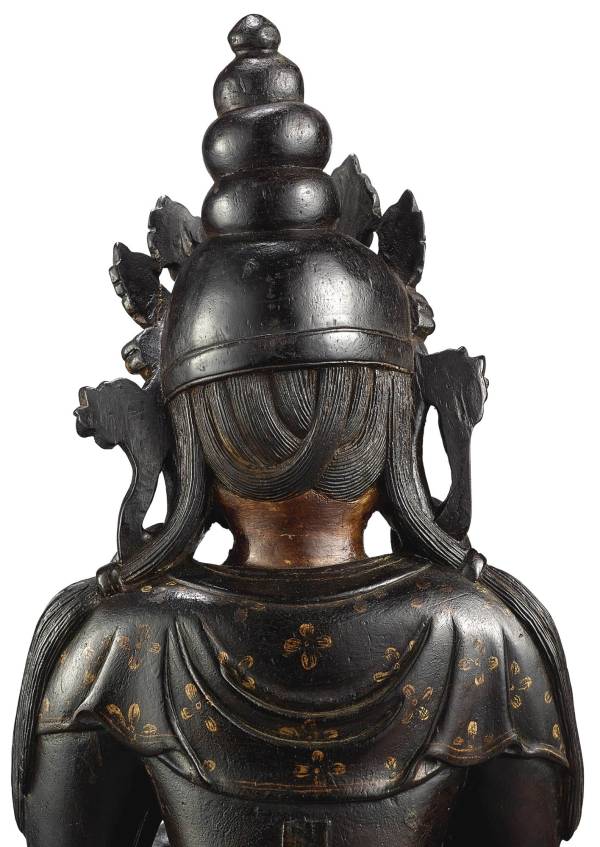 For another 15th century Tibetan zitan figure with similar gilt-lacquer floral decoration on the robes, see the figure of the monk in the John and Berthe Ford collection, illustrated in Pratapaditya Pal, Desire and Devotion: Art from India, Nepal and Tibet in The John and Berthe Ford Collection, Baltimore, 2001, p. 298, pl. 174.