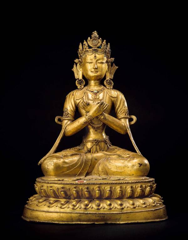 此像头戴花冠,头顶束高发髻,髻顶安半杵,耳际宝缯呈U字形向外翻卷,耳下垂大圆环;额部高广,双目俯视,眉间饰白毫,高鼻小嘴,妙相庄严。上身双肩披帔帛,帔帛末端于臂部向下垂于两膝,极富装饰意味,下身着短裙,腰间束宝带。周身装饰繁缛,在裙摆衣缘处錾刻花卉图案,胸前饰项圈和长链,手足饰钏镯,这些装饰造型美观,立体感强,而且上面都嵌有绿松石,体现了西藏地区造像的鲜明特点。结跏跌端坐于莲花宝座上,双手置胸前交叉,结金刚吽迦罗印,左右手分别持金刚铃和金刚杵,铃杵组合象征慈悲与智慧的结合,代表密教修行的最高成就和境界。全像躯体壮硕,肌肉劲健有力,体态优美舒展,造型大气完美,充分表现了金刚持在藏传佛教中的至尊地位和悲智双圆的宗教特质,具有震撼人心的强大视觉冲击力量。整尊造像尺寸高大,妙相庄严,制作精湛,应为大型寺庙所供奉。