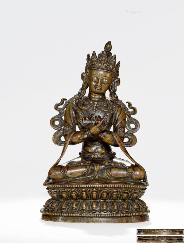 金刚总持结全跏趺坐于莲花宝座之上,左手执金刚铃,表示清静法音警觉一切有情;右手执金刚杵,表示摧破十种烦恼。面相圆润,神态安详。发髻高耸,宝珠顶严,头戴三角状五叶花冠,耳垂圆珰。上身袒露,胸前配饰璎珞,璎珞由连珠纹串联,非常精美。下身着长裙,腰系连珠纹腰带。显得雍容华贵,富丽堂皇。束腰仰覆式莲花座,上下沿饰一圈连珠纹,莲花瓣饱满修长。造像塑造的凌然气势,俊美柔和的面孔,比例精准的造型,挺拔雄健的身姿,高大醒目的莲座,刻画精细的璎珞,都是西藏造像艺术风格的真实体现,具有较强的艺术感染力。
