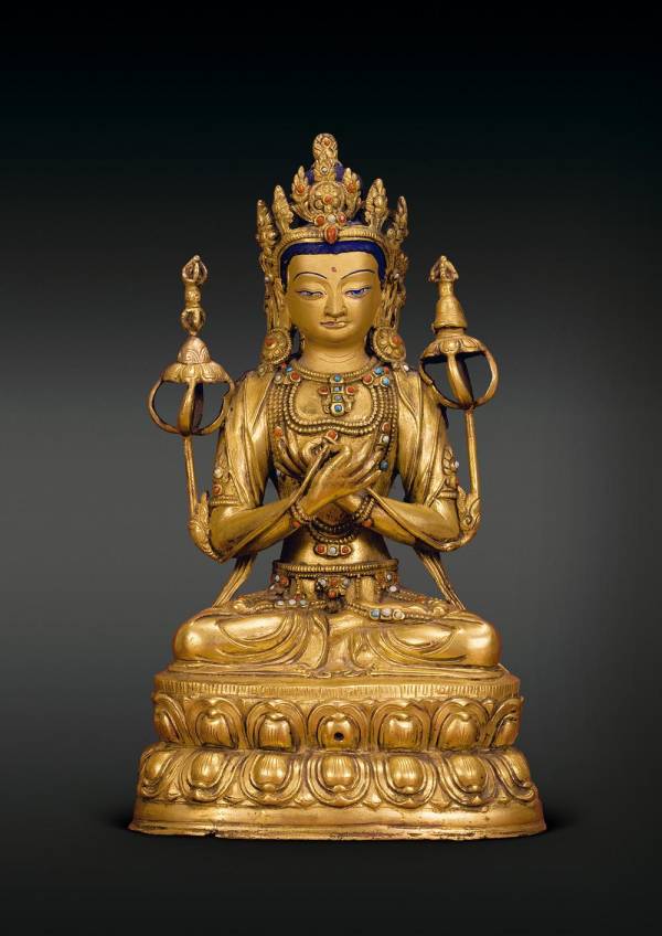 金刚持佛是印度梵语意译,是藏传佛教噶举派崇奉的本初佛。该尊造像面部泥金彩绘,面相丰颐,神态宁静,头戴花冠,束发高髻,髻顶置半杵,耳垂圆铛。上身双肩搭帔帛,胸前饰项圈、长链,繁琐异常,极具装饰特点。下身着裙,腰间系璎珞,手足有钏镯装饰。花冠、璎珞及钏镯上皆嵌有绿松石,体现出西藏地区造像的鲜明特点。跏趺端坐于双层仰覆莲座之上,双手置胸前结金刚吽迦罗印,手心各牵一莲茎,花朵开于肩侧,左肩花上置金刚铃,右肩花上置金刚杵,铃杵组合象征慈悲与智慧的结合,代表密教最高修行成就。 该造像体格高大,经典之处有三,其一,金刚铃与金刚杵奇大;其二,胸及腰间璎珞华丽异常;其三,双层仰覆莲座非常有特点,莲瓣宽大挺拔,其上阴刻莲蕊,非常具有区域特点,非常罕见。