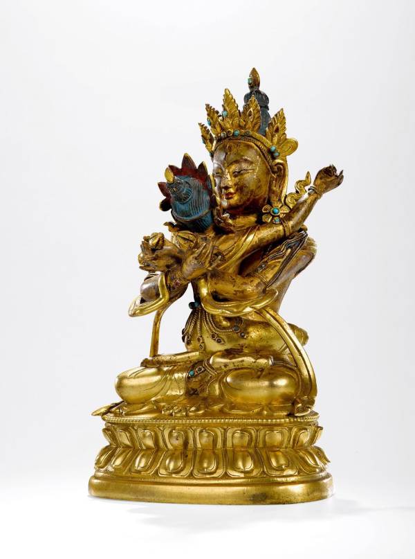 此尊金刚总持双身像,主尊头戴五叶宝冠,身着天衣帛带,腰间束长裙,全跏趺坐,双手拥抱佛母,在胸前结吽迦罗印,分别持金刚铃和金刚杵;佛母亦为相同装束,双手持嘎巴拉血碗和钺刀。佛母上半身与主尊分体铸造,衣饰均华丽优美,具有乾隆时期的典型风格,肌肤裸露处呈现原铜本色,宝冠、衣饰、莲台等处鎏金均保存良好。