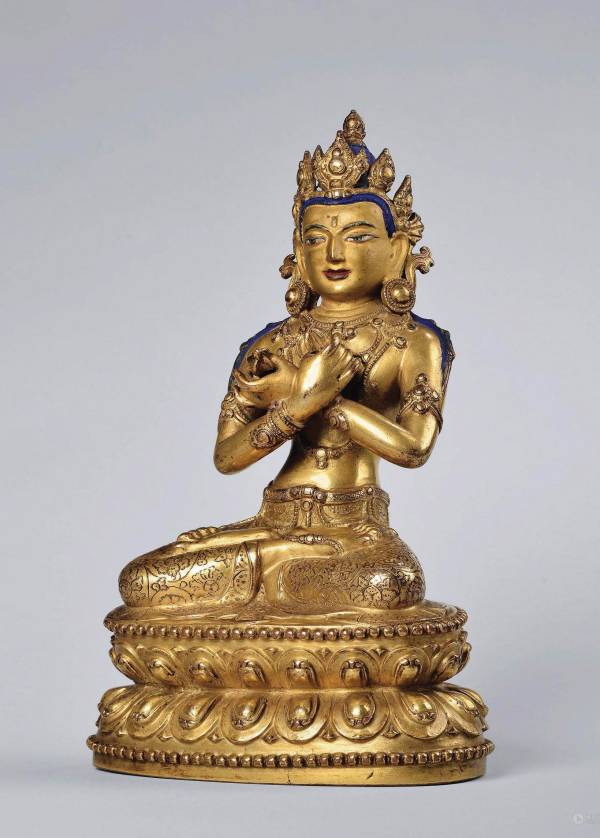 整尊造像鎏金饱满,金色锃亮,比例精准,上身肌肉感表现到位,体现了藏族匠师的审美情趣和高超技艺,具有典型的15世纪西藏中部地区造像特点。