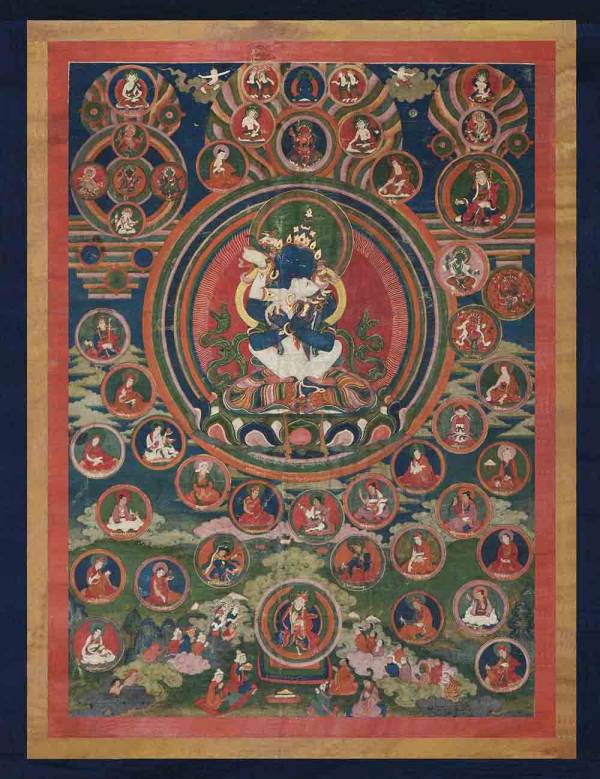 钦则画派双身大持金刚又名“胜者金刚持”,是藏传佛教无上密乘的本尊。本铺唐卡整体以蓝绿两色为主色调,主尊大持金刚头戴五叶宝冠,一面二臂,蓝色身,双手与胸前分执铃杵。拥抱一面二臂白色身明妃,明妃右臂揽主尊之颈,左手执嘎巴拉碗,昂首与主尊相视。主尊身后有圆形身光,由内而外分别为红、蓝、绿、橙、绿、黄、蓝、粉、绿、橙十种色彩身光环绕。主尊四周分列大量护法神及印度大成就者。细细观之,宁玛派的创派上师莲花生大师共计出现三次之多。其中最重要的一尊位于主尊正下方,似坐于地面法垫之上,周围环绕大量僧俗人士,看姿态应是在朝拜莲师。整铺唐卡尊像较大,重点突出,周围众小像排列井然有序。用色较为浓艳,富有浓郁的宗教神秘感。画芯之外为红黄蓝三层裱边,特别值得一提是唐卡背后主尊中央位置有三处呈三角形分布的朱砂指纹印记,此当时唐卡绘就开光之时高僧大德加持开光所留,这一开光标识使本铺唐卡更添庄重殊胜。