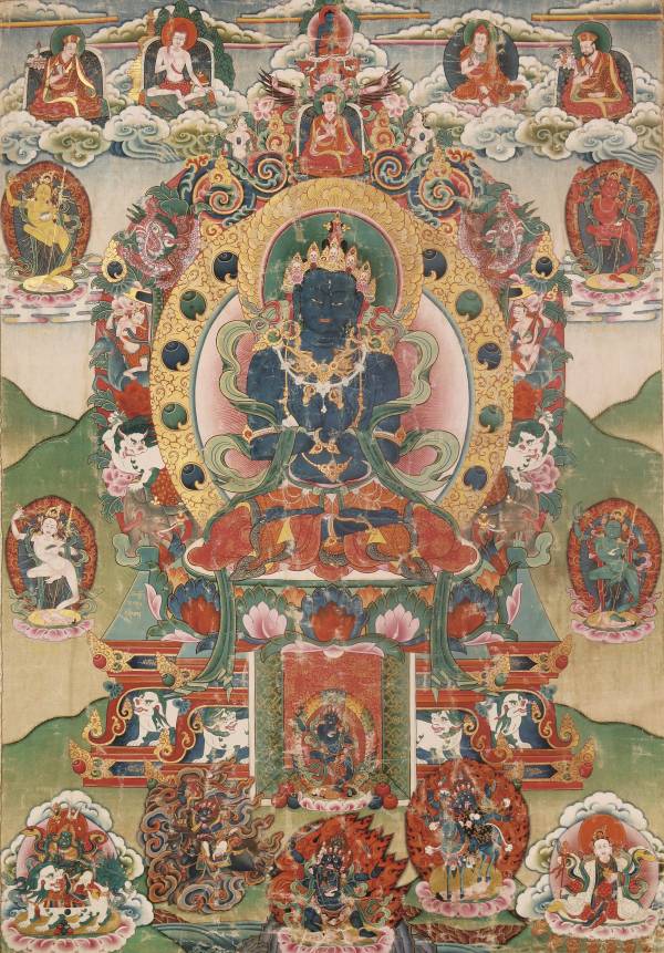 此幅主尊金刚持居于画面中央,全身天人装束,双手交叉于胸前并持铃杵,象征方便与智慧合一。主尊的上方主要绘制了金刚持的传承系统,其顶部的中央为释尊本尊,其次绘有格鲁各派多位重要祖师,均头戴标明其身份的班智达帽。主尊四周绘有五尊五色空行母,唐卡的最底层绘有吉祥天母、宝帐怙主等诸护法。从整个画面对诸本尊、上师、护法的排列次第来看,此幅唐卡以图像的形式解说了金刚持的主要传承系统。