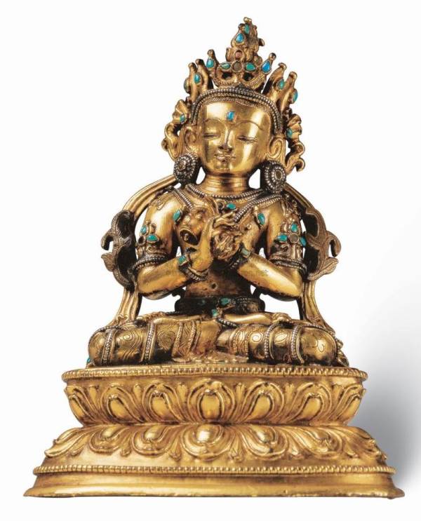 大持金刚是报身佛,又名持金刚,是释迦牟尼佛演说密法时化现的形象,故又称秘密主。此尊头戴宝冠,发髻高耸,缯带飘拂。头微侧倾,白毫凸显,弯眉与鼻胫相连,眼睑低垂,相容沉静。上躯袒露,披帛顺肩而下,嵌饰两茎莲枝。绸裙以尼泊尔珠链式作法装饰,其间錾刻花卉纹。束腰裙带的系扣采用铆接工艺,活动自如,别具匠心。双手于胸前结吽迦罗印,左执铃,右持杵,金刚双跏趺于莲花日轮座上。整像鎏金光粲,细节刻划入微,宝冠、璎珞钏环及绸裙、台座等部位嵌饰松石及银质连珠,显得雍容华贵又不失庄重典雅,堪称明代西藏金铜造像中的精品。