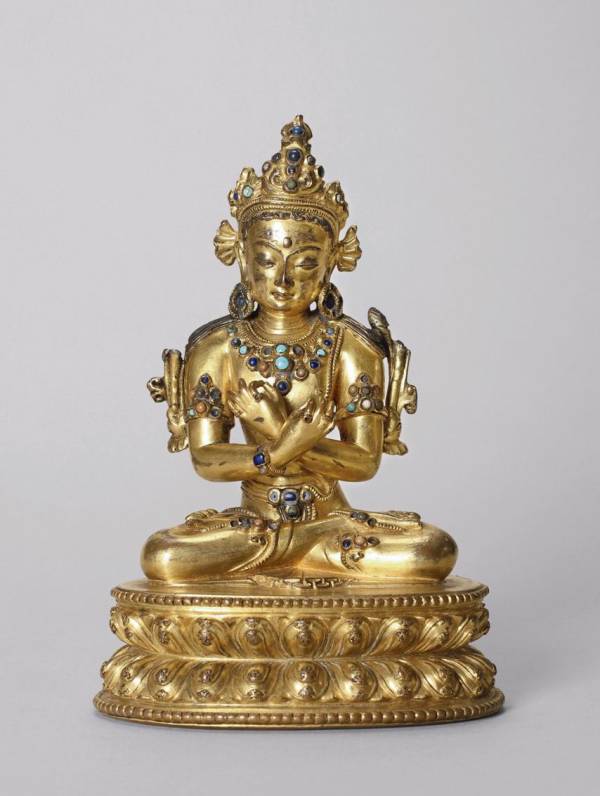 在藏密中,金刚持属本初佛,认为是释迦牟尼讲说密法时所呈现的形象,是释尊的秘密化身,故又称秘密主。一般形象为双手持铃杵,在胸前交叉,表示金刚部的菩萨摧毁魔敌时的智慧和法力。此尊头戴五叶冠,正面为弯月形饰物,应源自中亚萨珊王朝的皇冠。面颊圆腴,弯眉长目,相容寂静。身着天衣绸裙,佩戴璎珞钏环,宝冠璎珞镶嵌各种宝石,双手当胸结吽迦罗印全跏趺坐于束腰式仰覆莲花座,莲台上下缘饰连珠纹,属西藏仿尼泊尔造像。