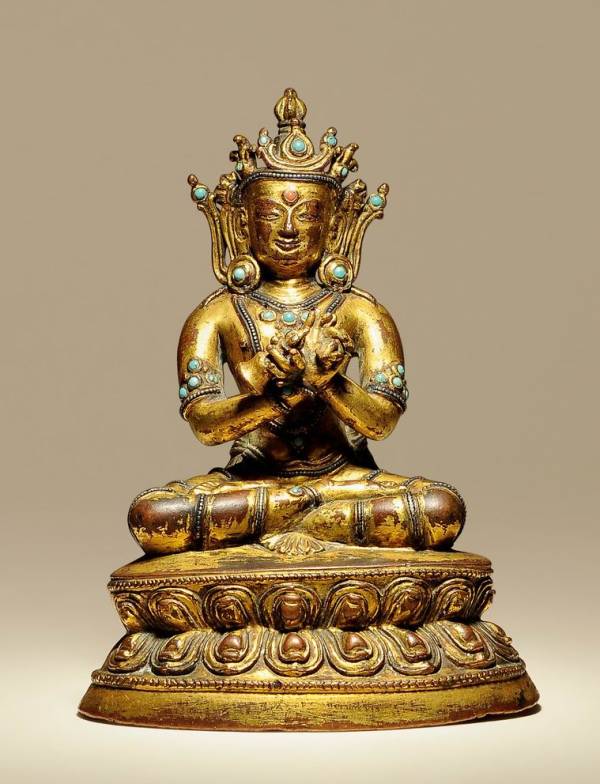 大持金刚是藏传佛教密宗极为推崇的圣尊,是消业灭罪的主尊。常持本尊真言,能破除烦恼,止诸恶念,生诸功德。佛教认为大持金刚是一切众生菩提心的本体,其心性坚固如金刚。双手所持法器金刚铃与金刚杵是其身份的重要标识。此尊头戴宝冠,头部微微内颔,面相方圆,神态祥和。圆型大耳珰垂至双肩,身上佩饰项链、臂钏、手镯等。身形端正,肢体圆润饱满,结全跏趺坐于莲花座上,莲座为束腰仰覆式,莲瓣饱满对称。造像为红铜浇铸,通体鎏金,全身佩饰嵌松石,发冠、项链、臂钏、腰带及裙褶等均以嵌银连珠表现,工艺精湛。此像工艺受尼泊尔造像风格的影响,端庄而华丽,为难得的上乘之作。