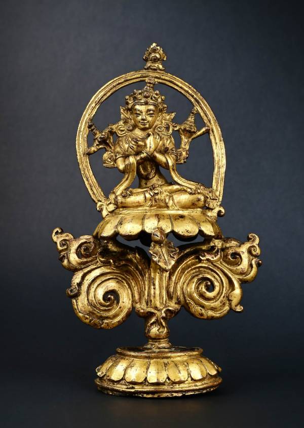大持金刚是印藏佛教中最为广泛接受的本初佛,尤其被格鲁派和噶举派所尊崇。其是一切的源泉,象征全能、自在。大持金刚的标志性持物是手执金刚铃和金刚杵,金刚杵象征牢不可摧,不可破坏,金刚铃象征智慧。此尊造像双手持莲茎,左右莲茎上各化现铃杵各一,其左右手交叉于胸前。其身后为卵型身光,身光环绕一周。像下为单层覆莲座,莲座下为卷草纹装饰的独脚支架,最下为覆莲底座,莲瓣刻画光滑、线条简单。本大持金刚样式较为少见,结合支架形式推测最初应为佛堂供设使用。