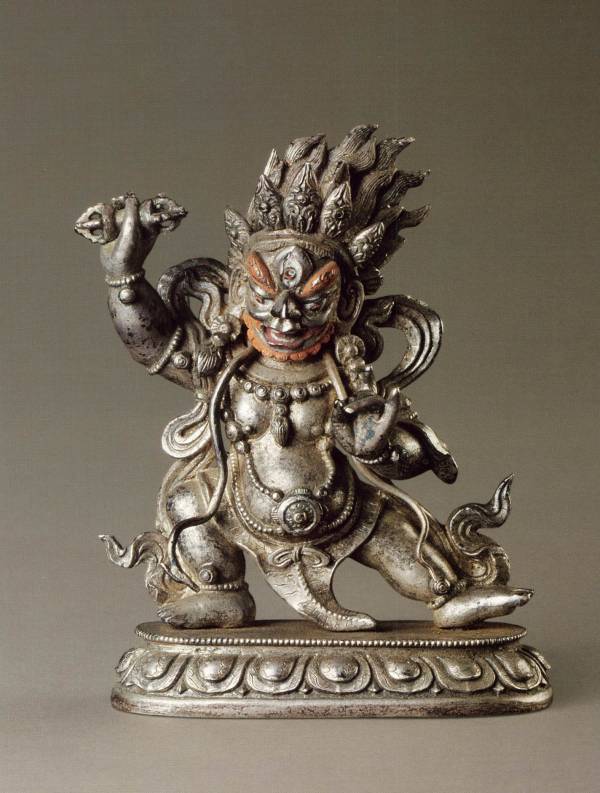 尺寸:高8.5cm 年代:清代 质地:银制 风格:北京 来源:北京首都博物馆 参阅:北京市文物事业管理局编.北京文物集粹大系 金银器卷.北京:北京出版社,2004.4 鉴赏: 右手高举金刚杵左手结期克印金刚手菩萨像(首都博物馆藏)