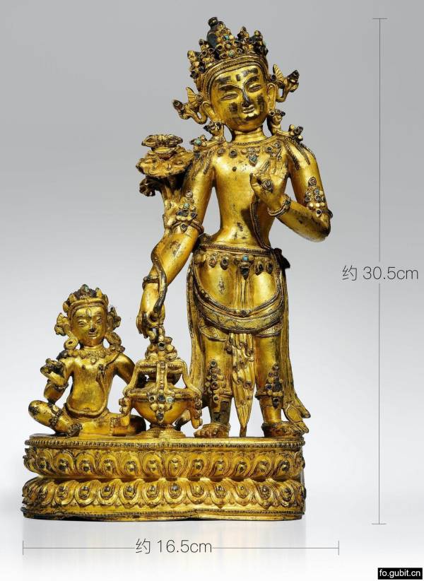 此尊右侧立像是金刚手菩萨,菩萨身体呈优美的三折枝式,赤足立于莲花座上;面庞丰润,方形白毫凸显,眼睑低垂,相容沉静;头戴五叶冠,顶结高髻,余发披于两肩;身着天衣绸裙,錾花的帛带周身相绕,胸前璎珞、臂钗、脚环有松石等宝石镶嵌,华丽精致,极尽奢侈;左手当胸托金刚杵;右手持莲,并轻抚居中的宝瓶,莲花中置一金刚杵。菩萨左侧为大成就者,其如意坐于宝座之上,浓眉大眼,面相方圆丰润,头戴宝冠,耳缀圆珰,袒露前胸,左手抚宝瓶,右手高举于胸前。这件作品的关键在于宝瓶,藏传佛教以重视教法传承闻名,亦即所谓的「灌顶」。这个观念源自古印度王子继承王位时,国王用一个瓶子把海水浇灌至太子头上,表示从此以后太子便获得了王位。佛教则借用这种仪式于教法授受,宝瓶正是仪式过程中最重要的法器。因此,本尊组合即是象征性的表现金刚手菩萨向大成就者传法。整像造形完美,比例精准,身躯肌肉感表现到位,璎珞佩戴繁复,工艺精湛,风范非凡,为古代藏传金铜造像中之精品。