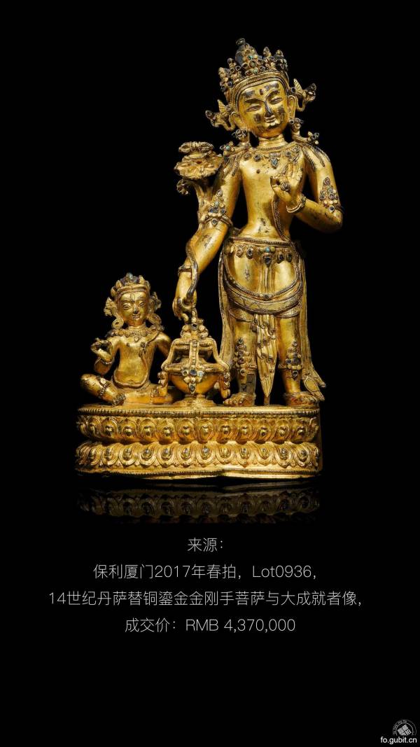 丹萨替寺佛像十分稀少,目前散见于各大小公私博物馆、私人收藏、艺术市场和拍卖会上,据初步统计,总数约100余尊。因此丹萨替造像在国内拍卖市场上一经问世都是喜马拉雅艺术收藏圈一个不小的事件,2017年北京保利春拍上一尊14-15世纪的丹萨替大随求佛母就以3450万人民币拍出(图六)。2018年北京古天一秋拍上,一尊14世纪的丹萨替释迦牟尼的以678万人民币成交(图七),2016年北京巨力春拍上一尊14世纪丹萨替四臂吉祥天母也拍出了920万人民币的好价格(图八)。而以金刚手菩萨与大成就者作为组合题材的造像在丹萨替所有题材造像里是最少见的,据资料显示,此类题材造像全世界仅有十余件,布达拉宫藏品中有一件类似造像,可作比较。此外,西泠印社2016年秋拍曾以575万人民币的价格拍出一件相似作品(图九),表明该题材逐渐受到市场关注,前景可期。做为此次龘藏2019年夏季拍卖会的封面作品,此尊14世纪丹萨替金刚手菩萨与大成就者组合造像风格明确、工艺精细、来源清晰、传承有序,是近年来少有的精品佳作,我们希望借由此尊造像以龘藏之名,续写丹萨替寺的金色辉煌!