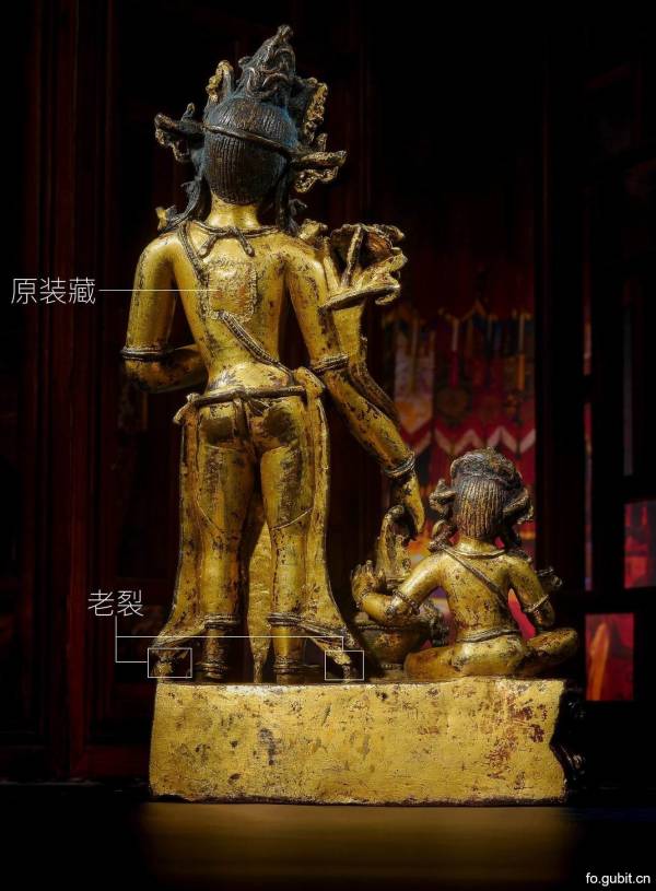 注解:原装藏, 部分宝石遗失, 老磕碰, 主尊与莲座之间是一体铸造, 有老裂和铸造缺陷