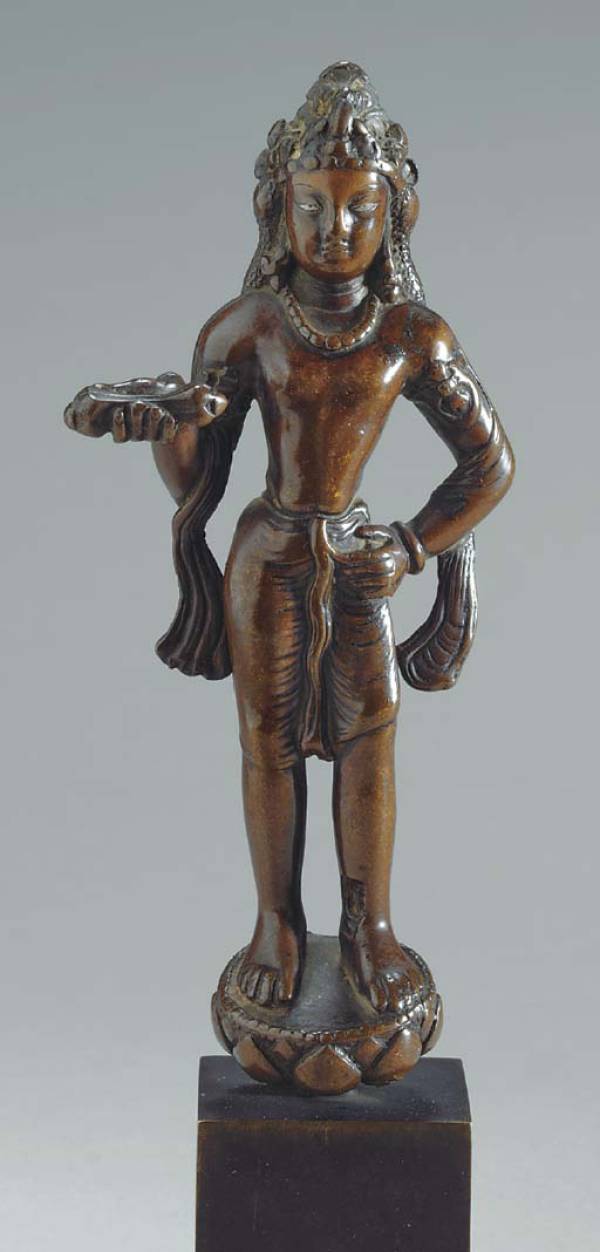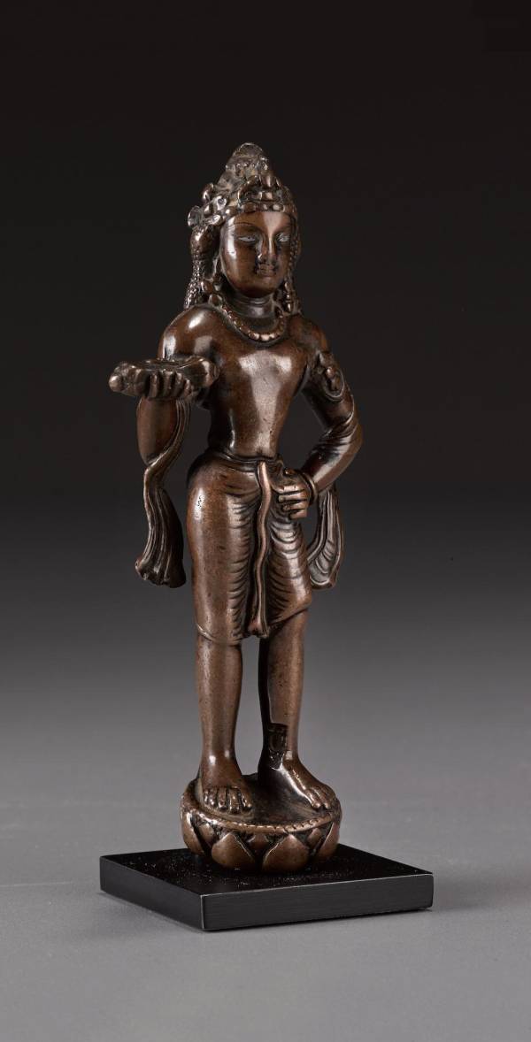 The figure with a dark brown smooth patina, standing on a lotus holding a vajra, wearing a sash on his shoulders and an elaborate headdress, the eyes inlaid in silver