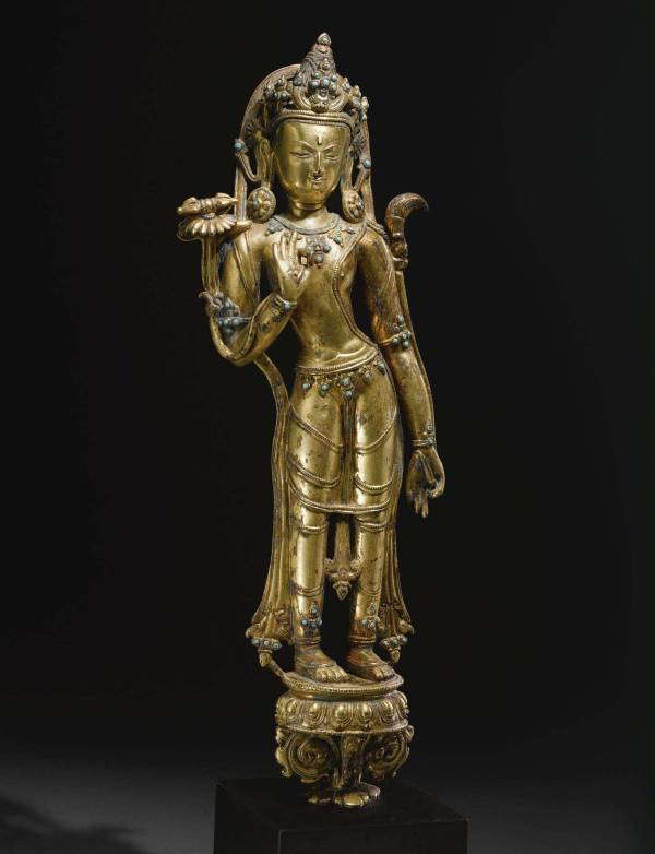 The statue would have attended a larger central deity, probably a seated Tathagata, with a similar bodhisattva, possibly Padmapani, standing on the opposite side. Tibetan thankas, certainly from the eleventh century through the fourteenth century, portray Tathagatas and sometimes religious hierarchs with standing attendant bodhisattvas, see Steven M. Kossak and Jane Casey Singer, Sacred Visions; Early Paintings from Central Tibet, p. 60, Pl. 4, & p. 89, pl. 17. Flywhisks are carried by both Vajrapani and Padmapani in two seated bronze attendant bodhisattvas from Nepal, see Ulrich von Schroeder, Indo-Tibetan Bronzes, Hong Kong, 1981, p. 354, pl. 93A, C. A fourteenth century standing gilt bronze Tara, now in the Ngor monastery in the Tibetan province of Tsang, is closely comparable to the Vajrapani, with a very similar crown style, facial expression, jewelry design and attenuated form, see Ulrich von Schroeder, Buddhist Sculptures in Tibet, 2001, p. 1034, pl. 257A