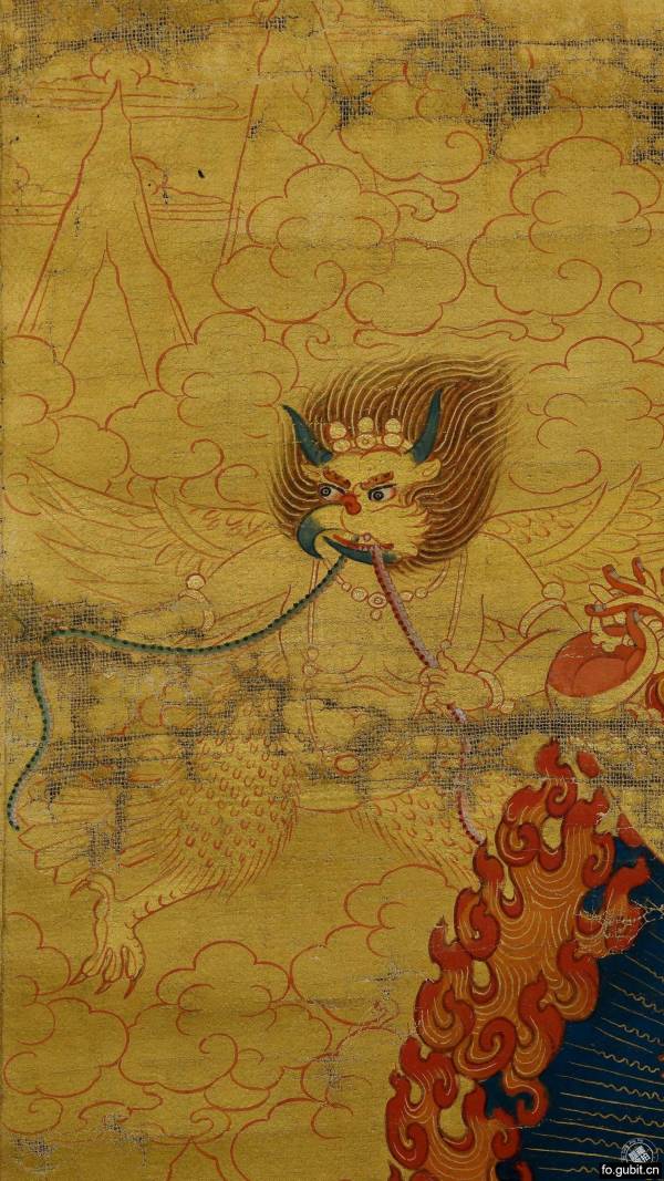 备注:通过题记内容与画面表现神格,可推测此唐卡神格来源于:五大鹏金翅鸟金刚手法本。此法目的是为了保护众生,战胜以蛇为代表的一切有害力量。