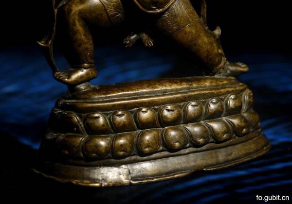 此像表现的是藏传佛教中金刚手菩萨的常见形象,右手持五股金刚杵,左手结威慑印。菩萨面庞较圆,两颊肉感突出,口张如盆,表情狰狞可怖,呈现大忿怒像,身体壮硕,造型比例合理,上身袒裸,腹部圆鼓;左展姿立于仰覆莲台上,莲瓣为双层,呈扁圆型,工艺精湛,极有张力。此造像最难能可贵的地方有三点,一般我们见到的金刚手菩萨手持的都圆雕造像,此尊只有一半,造像的背后完全是没有的,这极有可能是制作此尊金刚手时需要讲其贴在墙壁上供养,故而不做背面;第二点便是对菩萨肌肉线条的刻画,此尊金刚手造像整体线条力度十足,其肢体塑造具有强烈的肌肉感,例如上举的右手、微曲的右腿,这些姿态不仅力量雄浑,同时还不失动感,给人以饱满的活力。第三,此尊金刚手还带有原装的经书。