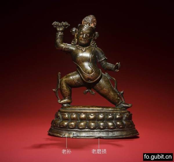 注解:带有原装的经书;有老补,老磨损;有铸漏,底座有背光插孔,背光遗失;