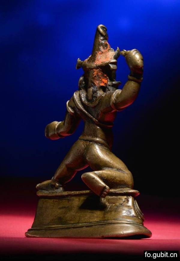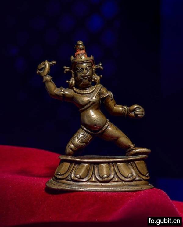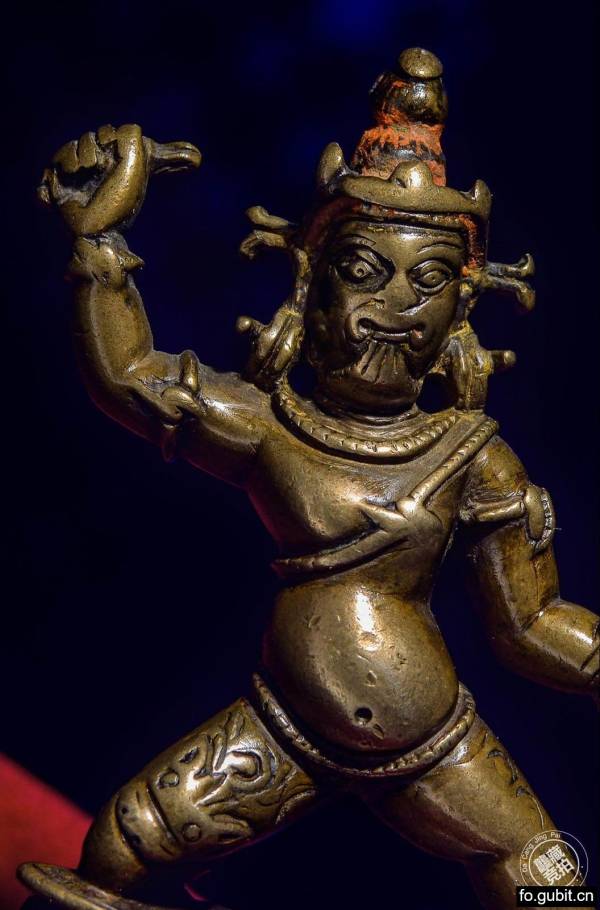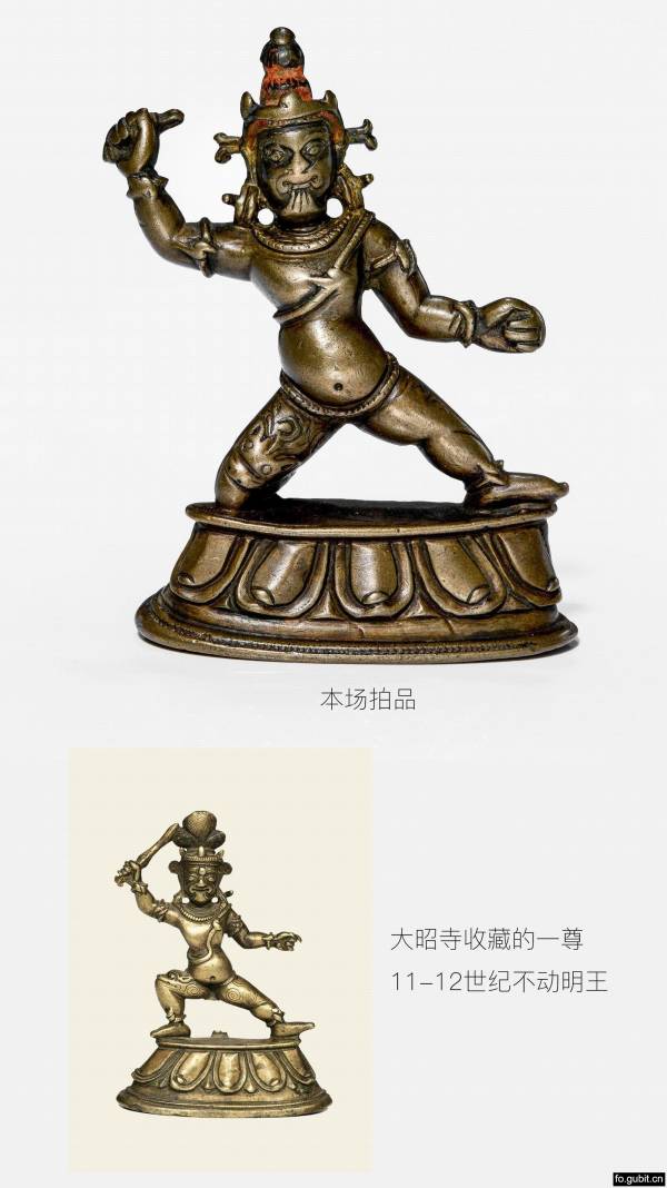 本尊造像尺寸不大,但整体强劲有力,神态威严. 菩萨头戴小三叶宝冠,发赤上扬,面部五官紧凑,双目圆睁,牙齿仅仅咬着下唇,十分怖畏,佩戴蛇形大耳珰垂于双肩,气势非凡;四肢粗壮,敦实有力,肌肉非常饱满,右手施期勉印,高举金刚杵,左手结忿怒拳印,代表具有摧毁魔敌的力量;双腿健壮右屈左伸,以跪姿于莲台之上,张开的双腿稳如泰山,气势非凡,具足摧毁魔敌的力量,值得注意的是金刚手菩萨基本上都是以右展姿出现,而跪姿多见于不动明王形象中,跪姿的金刚手菩萨造像尚属首次出现,特别罕见. 金刚手菩萨以蛇为装饰,腰部、手臂、脚踝等处缠蛇,暗示其为龙神之主的身份,其中一条毒蛇经过双乳交叉绕,代表无上法力,更加彰显其忿怒威猛,神威四射. 莲瓣规整,张力十足,尖端稍卷,时代特征明显,整体细节与大昭寺收藏的一尊11-12世纪不动明王(图一)一致。这尊造像有着力拔山兮之势,体态扎实有力,神态怒中有威,铜质细腻,光滑明亮,肢体协调,富有动感,是11-12是西藏本土造像中的精品之作,表现出很强的艺术感染力。