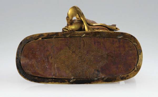 debout en pratyalidhasana, écrasant une figure féminine allongée sur un socle lotiforme moulés séparément, le bras droit levé près de la tête, l'attitude féroce, la tête courroucée aux yeux exorbités, la chevelure rouge dressée derrière une couronne à cinq pointes, le corps replet couvert de bijoux et d'un serpent en guise de collier, les hanches habillées d'une peau de tigre, scellé (2)