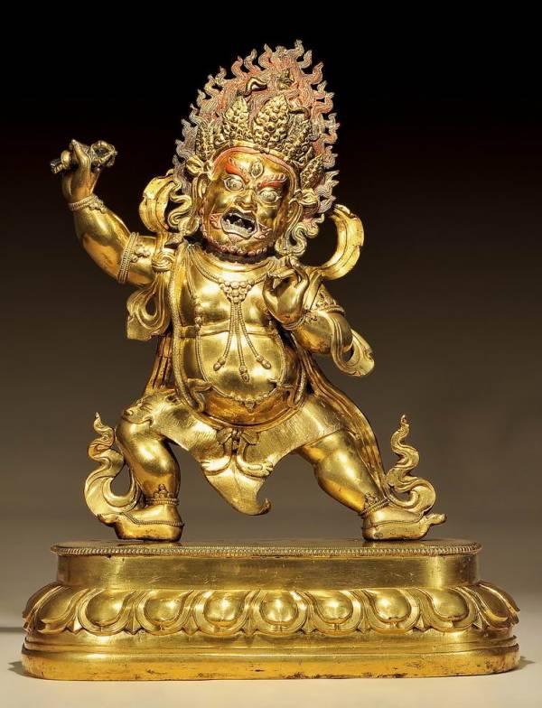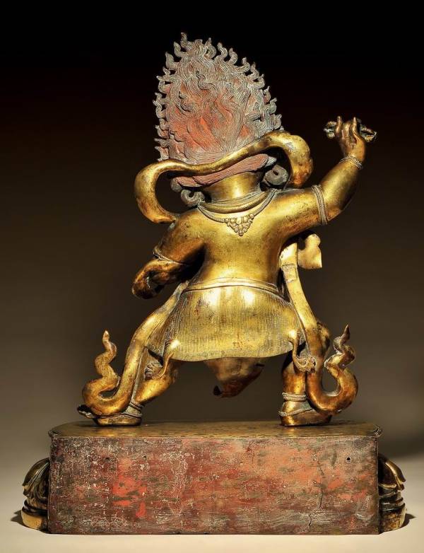 3.工艺。此像明显具有乾隆宫廷造像的工艺特征,这种宫廷标准样式反映在其整体气质与精妙的细节刻画中。该像的眉毛与头发如火焰般燃烧,三目怒视前方,张嘴呲牙,忿怒情态表现得十分生动。左手于胸前结期克印,右手高举五股金刚杵,呈左展姿立于莲座上,整体强调动态之美,丰富的肢体动作强化了忿怒情态的表现力。造像多处细节刻画得十分传神,比如头发中与胸前的长蛇、腰部的虎皮,均表现得栩栩如生。飘扬的帔帛增加了造像的动势,细密的连珠式璎珞、钏镯提升了造像的华贵之感。莲座庄重大气,双层覆莲瓣素面,工整精致,瓣尖略上翘。莲座下缘微微鼓出,为乾隆宫廷造像的典型样式。