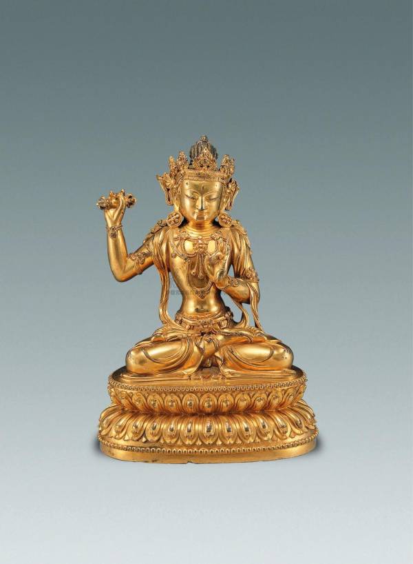 此尊头戴花冠,顶盘横髻,面部宽平,额际高广,面相慈和宁静。双耳垂肩,饰圆形耳环。上身挂繁复璎珞,下身穿长裙,双肩搭帔帛,衣纹流畅写实。双膝结跏而坐,右手高举执金刚杵,左手当胸结印。下为双层束腰莲花座。莲座正前方有“大明永乐年施”刻款。整躯比例匀称,造型完美,工艺精细,体现了明代永乐宫廷造像的最高艺术水平。