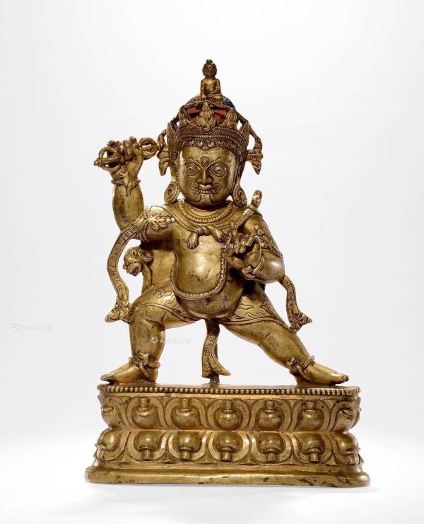 金刚手菩萨,又名“秘密主”,梵名 Vajrpi 藏名恰那多杰,属金刚部,因手持金刚杵而得名,为大势至菩萨的忿怒化现,为藏传佛教崇奉的三大依牯主之一。此尊造像三目圆睁,袒胸露腹,四肢及耳铛皆饰以蛇钏,顶髻饰以化佛,左手结期克印,右手高举金刚杵,下身着虎皮裙,体态墩实有力,左展姿立于双层莲座之上。