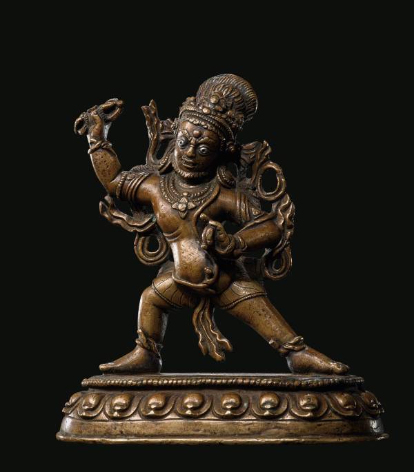 尺寸:高10cm 年代:13-14世纪 质地:合金铜 嵌银嵌红铜 风格:西藏 来源:拍卖会 成交:368,000元(2016.11) 参阅:中国嘉德 鉴赏: 此尊造像双目圆睁,蓄短须,忿怒相,袒胸露腹,四肢及躯干饰以蛇钏,头戴花冠,左手结期克印,右手高举金刚杵,下身着虎皮裙,体态墩实有力,左展姿立于双层莲座之上。十二至十三世纪西藏本土造像,受帕拉造像影响颇深,故而在造像中嵌银嵌红铜的技艺也越发精湛,一如本尊,周身多处均以错银错红铜做为装饰。