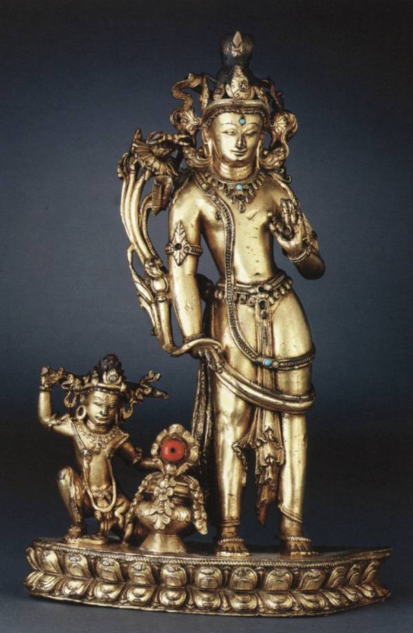 尺寸:高约21cm 年代:14世纪 质地:铜鎏金 风格:西藏 丹萨替寺 来源:私藏 参阅:外部链接 鉴赏: 可以参阅非常相似的一尊: 14世纪西藏丹萨替寺风格铜鎏金金刚手菩萨与不动明王(艺珍艺术)