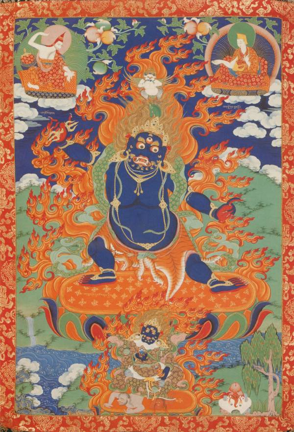 A the upper left is the Indian scholar Dharmakirti. At the upper right is Lodrag Khenchen Lekyi Dorje. At the bottom center is the protector deity Dorje Shanglon.