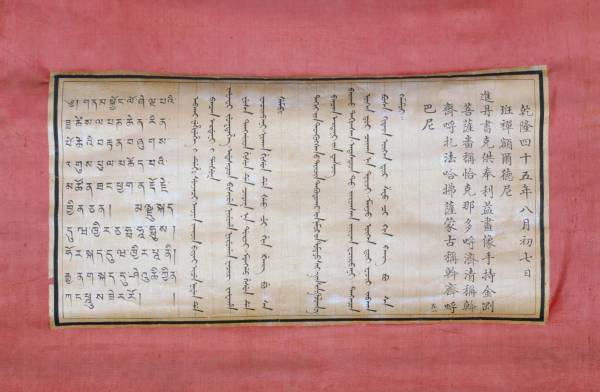 唐卡背面有汉满蒙藏四体墨书白绫签,其中汉文为:“乾隆四十五年八月初七日,班禅额尔德尼进丹书克供奉利益画像手持金刚菩萨……左一”。