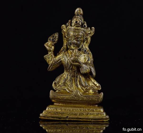 尚龙护法是药师佛的不共护法,为药师佛殿主供护法之一。此尊造像,一面三目,三目圆睁,张口露齿,髭须如火,表情威猛可怖,生动传神。头戴宝冠,发髻高耸,着平板翻领长袖长袍,广袖宽袍、轻盈质朴,主尊身体粗壮,四肢有力,做工精致,飘逸自如;一手托宝瓶,一手托摩尼宝,以威武之姿立于宝坐上。此尊尚龙护法寸佛形象生动传神,品相一流,材质顶级,通体鎏金,级别甚高,题材稀少,不可多得。